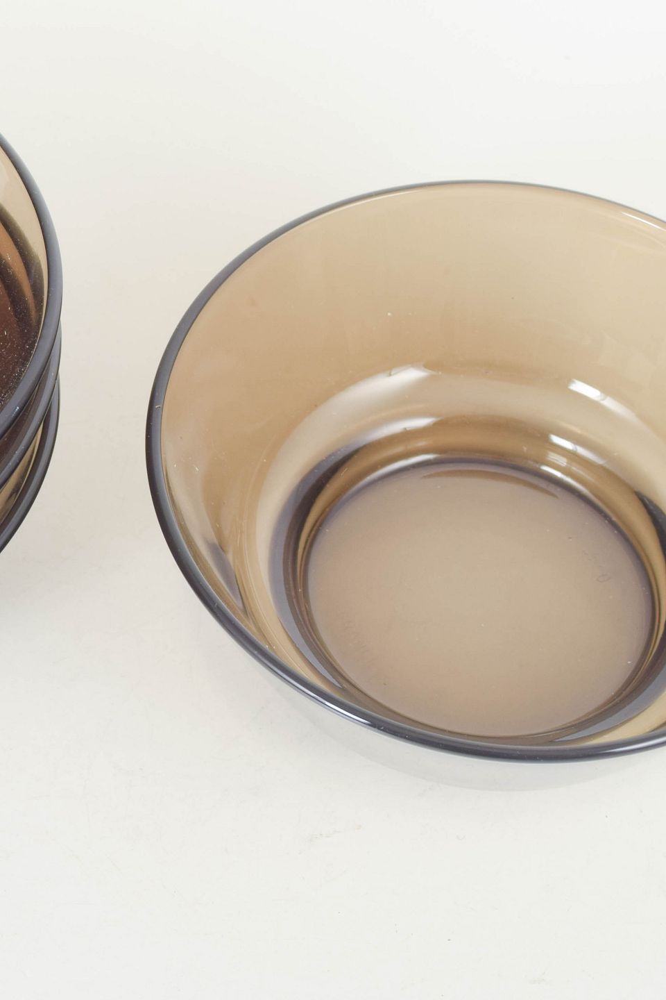 Fire stablebare skåle i presset glas med let konisk form og røgfarvet toning, fremstillet i Frankrig og mærket fra producenten.