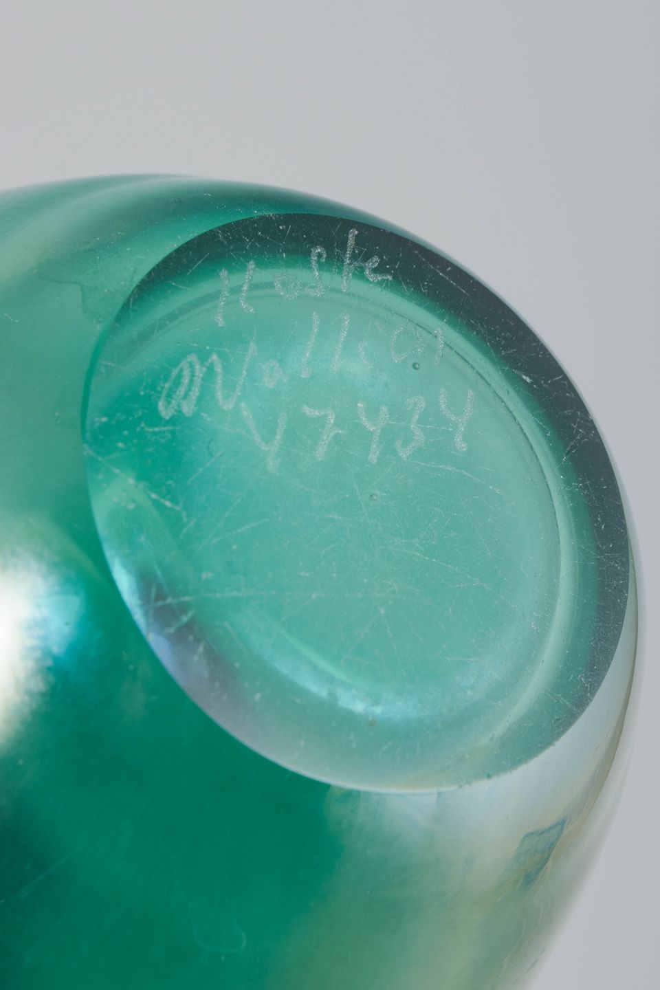 Elegante mundblæste glasvaser med organisk form og iriserende overflade i grønne og gyldne nuancer, der skifter i lyset.
