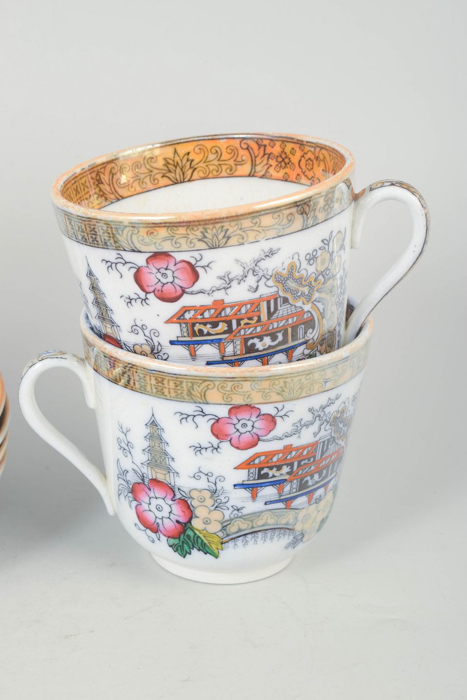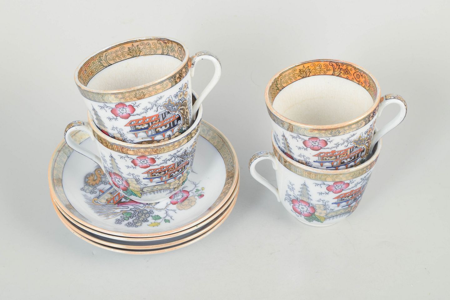 Store kopper i fajance med tilhørende underkopper, dekoreret i polykrom orientalistisk japansk stil med pagodemotiv, bygninger, fugl og blomster. Model Japan, produceret i perioden 1866–1925 og dateret til 1880’erne.