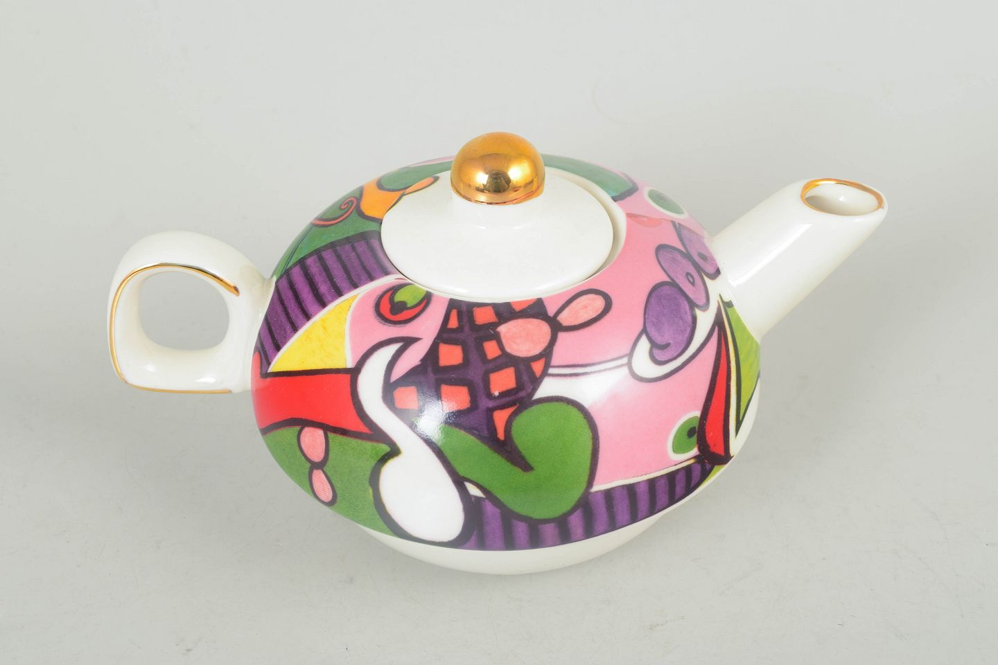 Tekande i porcelæn med låg, mærket Picasso. Rundet form med farverig dekor i stærke kontraster samt guldkant på knop og tud, typisk for sen 1900-tals produktion.