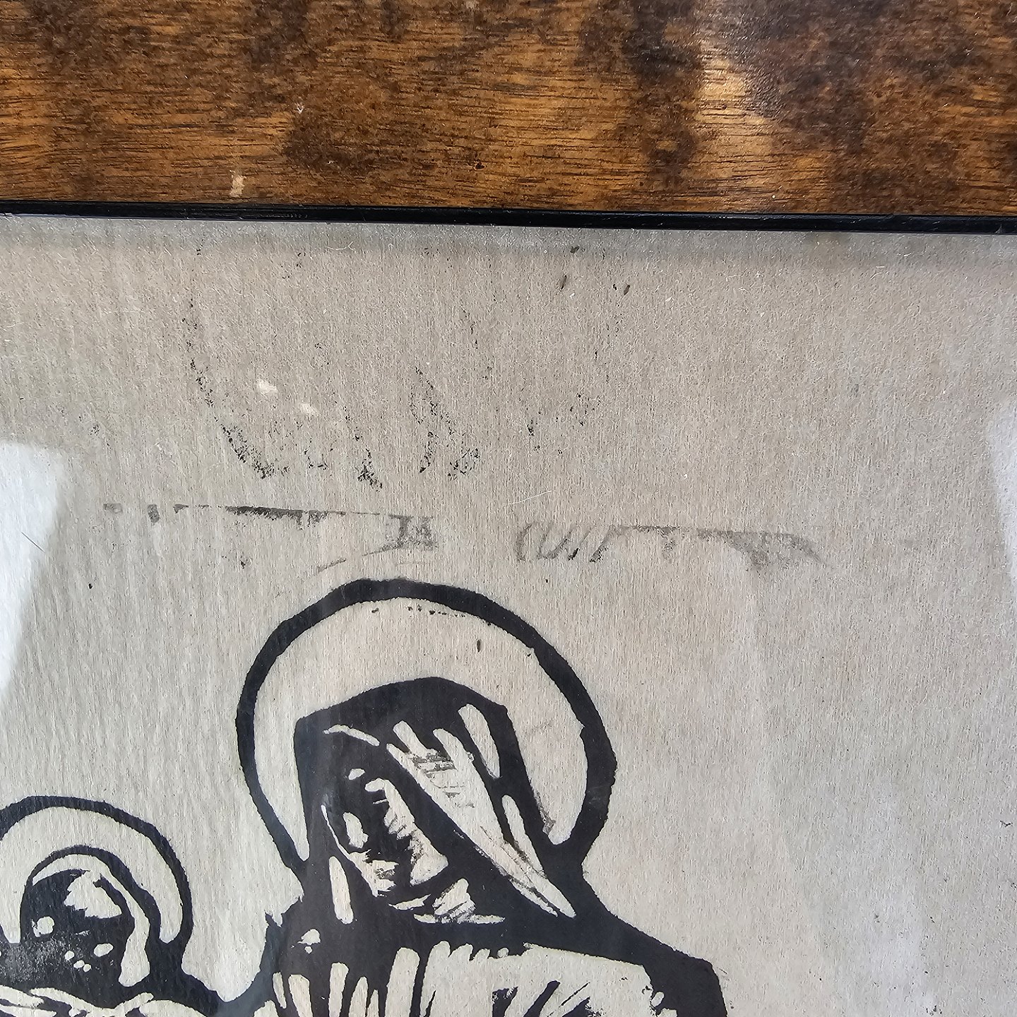 Trykt træsnit med bibelsk motiv, monteret i træramme og dateret 1932