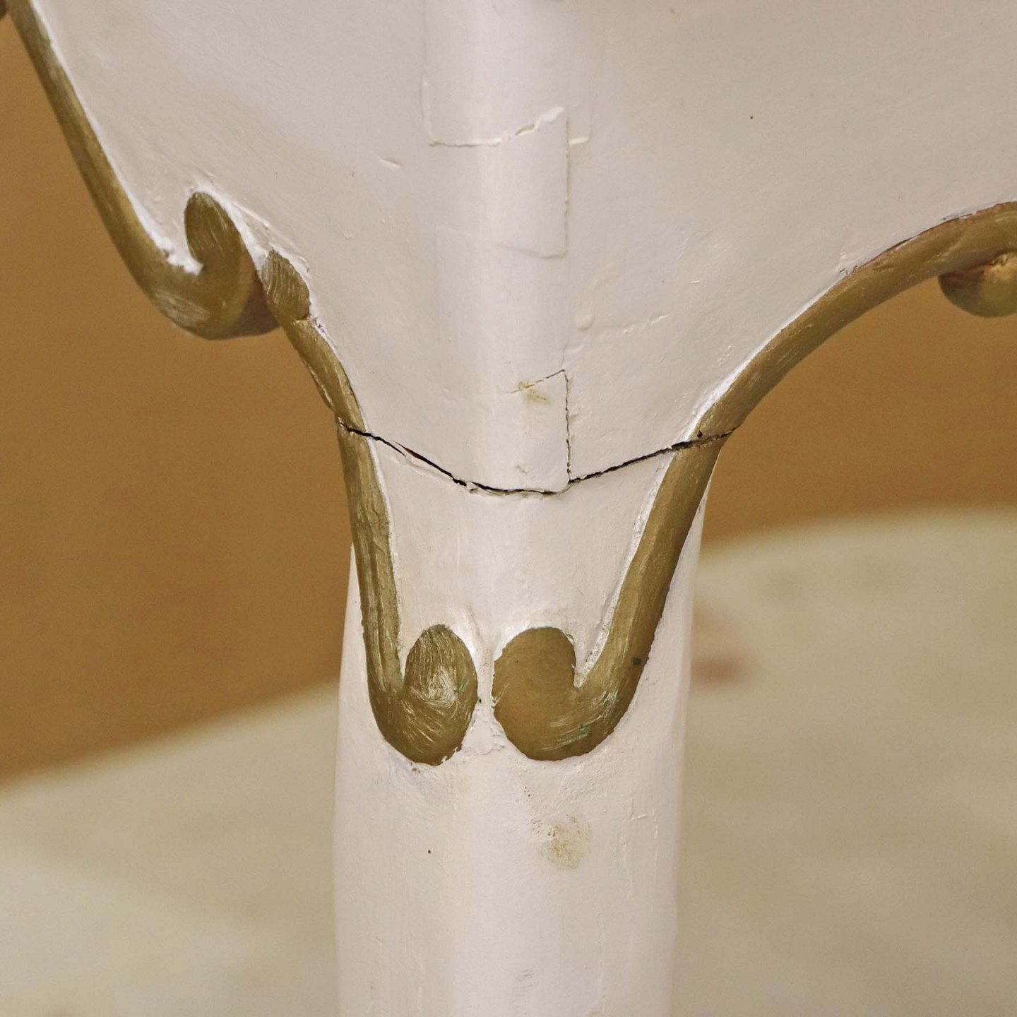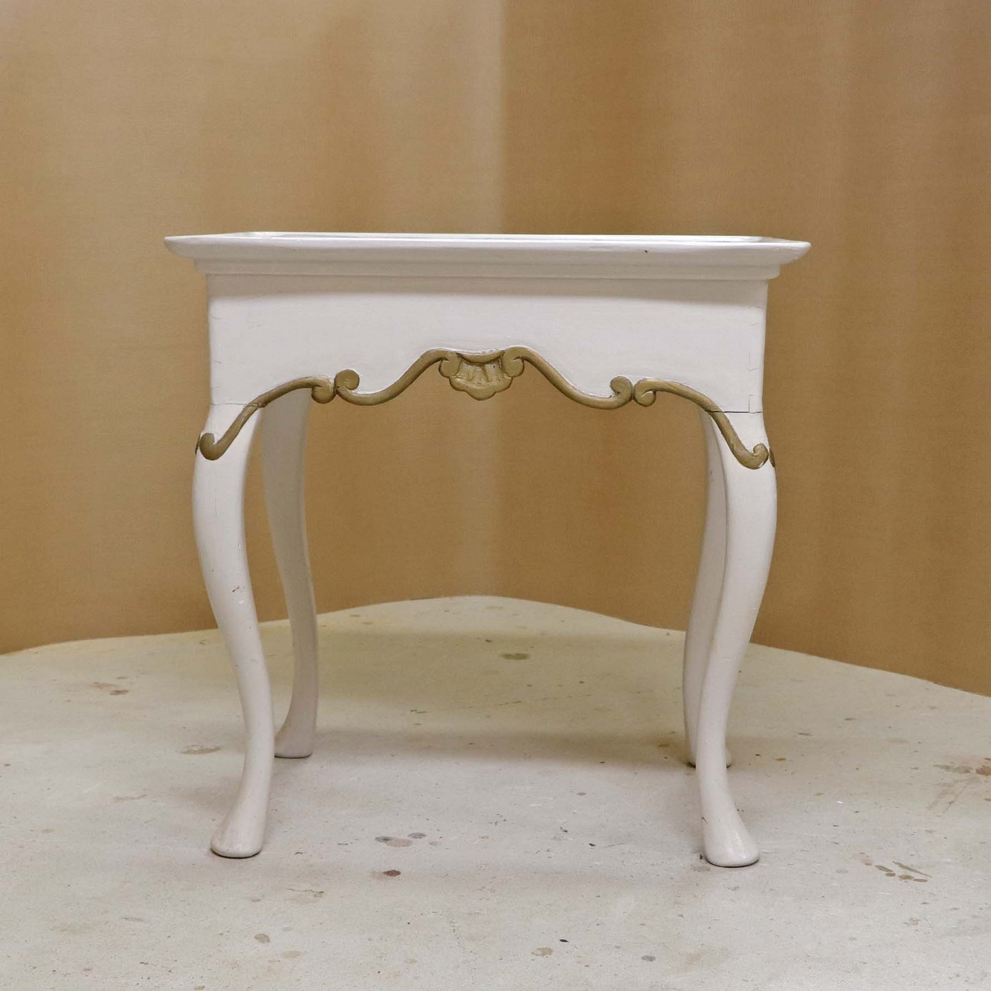 Antik hollandsk entrebord med svungne ben fra 1800-tallet i hvidmalet træ med guldmalet mønster og håndmalede delft kakler i blå streng med motiv af blomsterkrukker (Blumenpot) og hjørnedekoration i Wan Li stil.