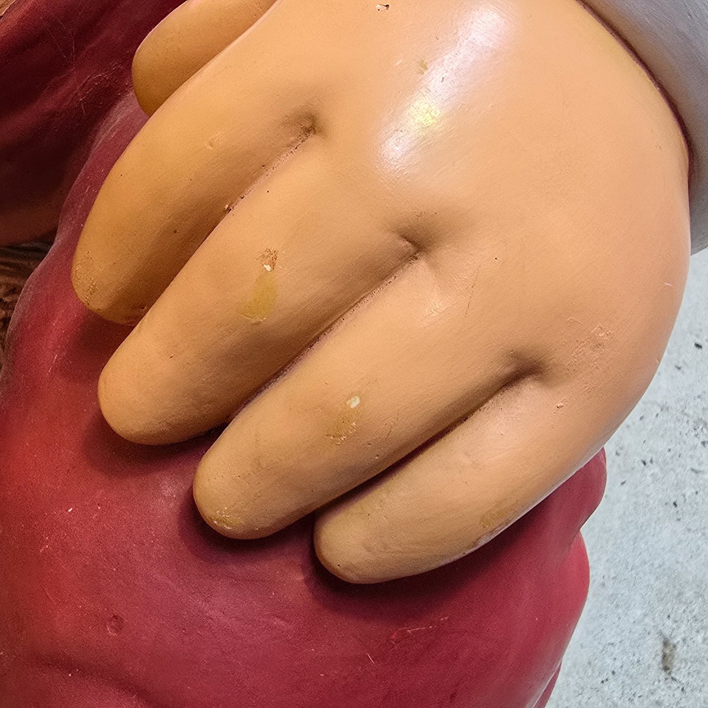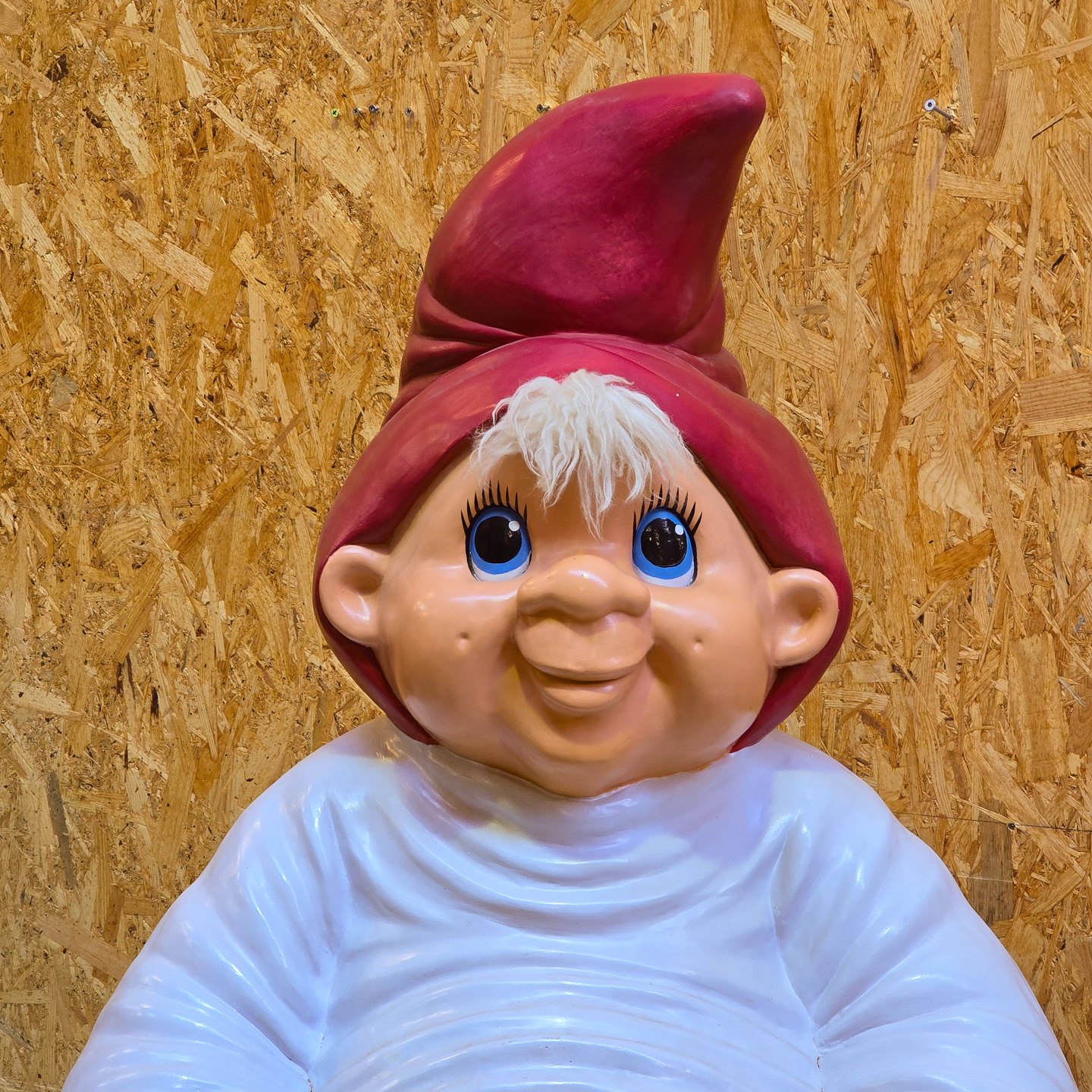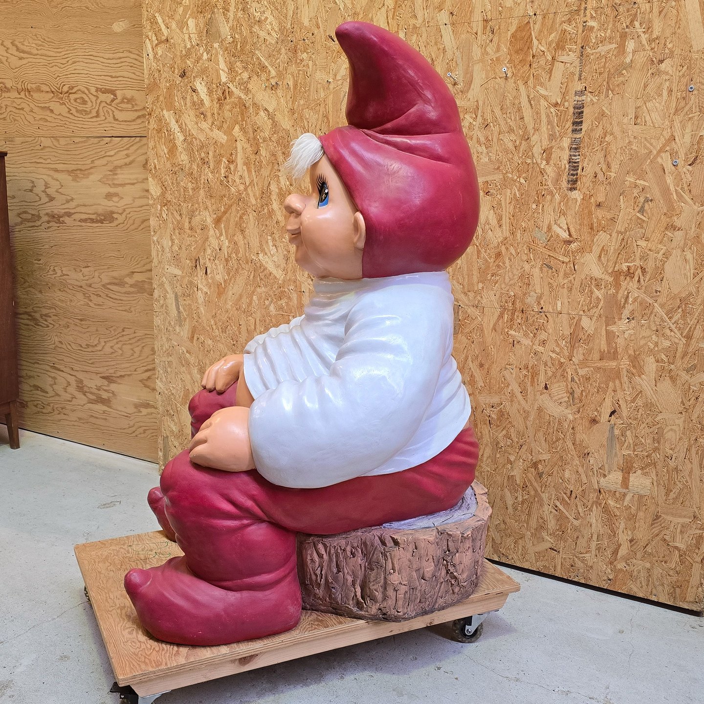 Stor udstillingsmodel i malet glasfiber med motiv af Klarborg nissen Oscar fra åretsnissepar år 2001, som sidder på en træstub. Figuren er fremstillet i et begrænset antal.