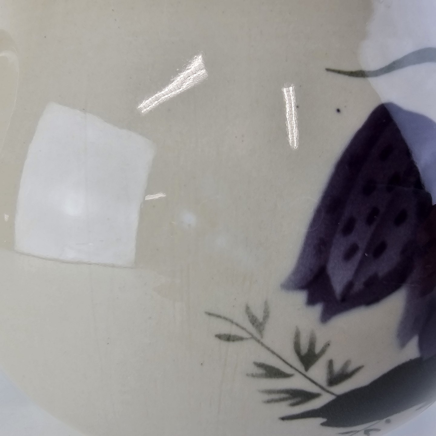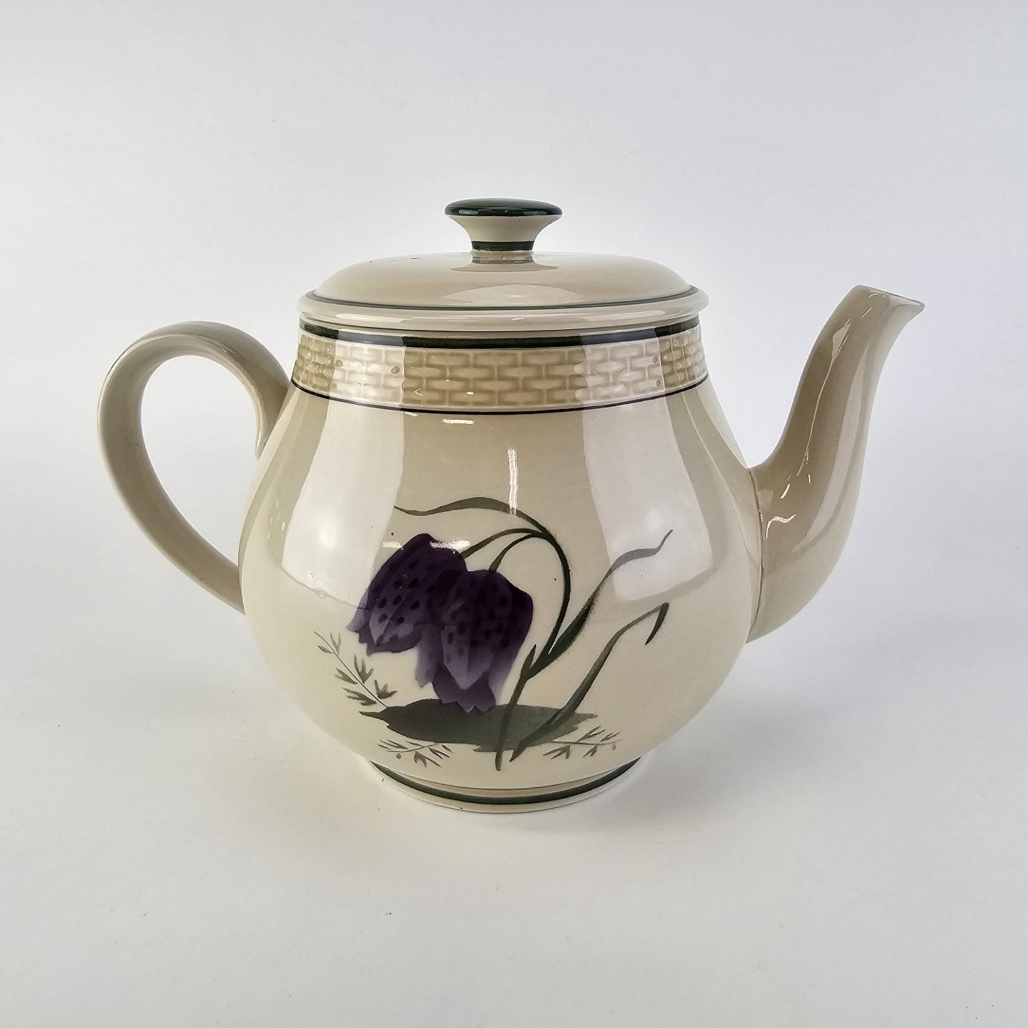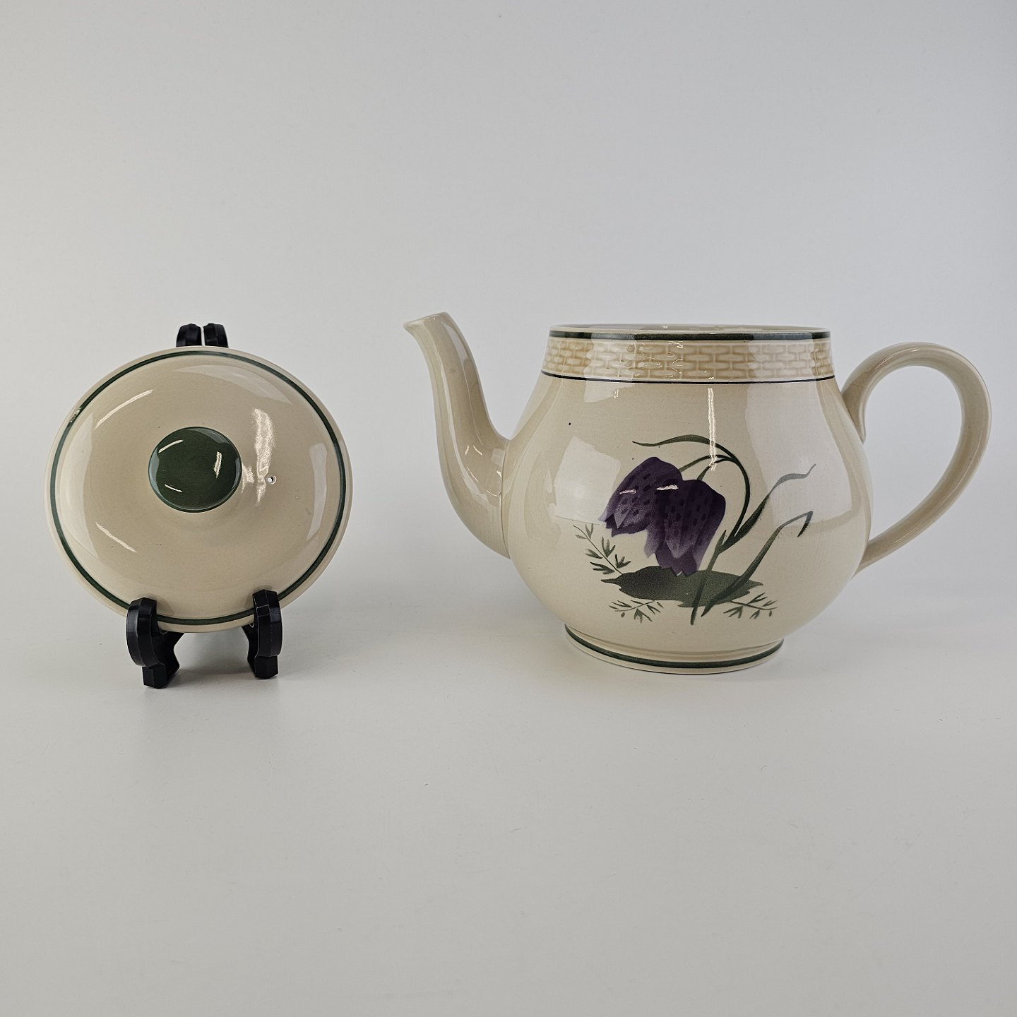 Fajancestel i stelform Viktoria II (Fletværk) med flettet kant og dekoration af en vibeæg blomst i violet og grøn, fremstillet i perioden 1934-1967