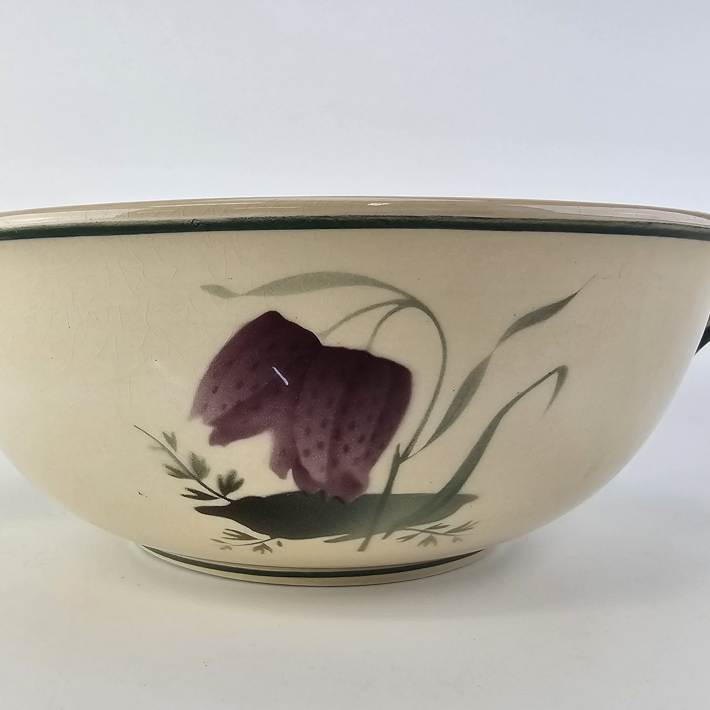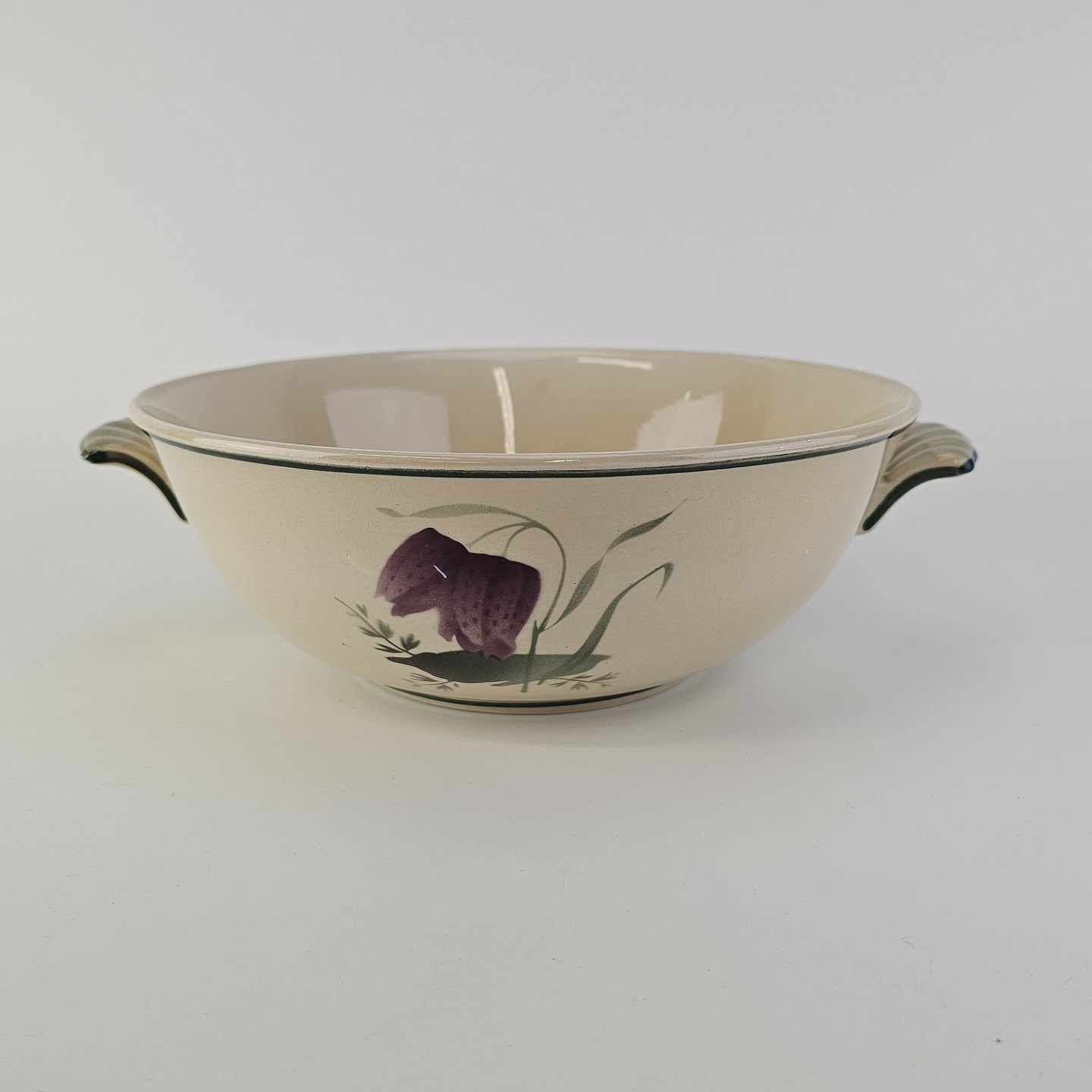 Fajancestel i stelform Viktoria II (Fletværk) med flettet kant og dekoration af en vibeæg blomst i violet og grøn, fremstillet i perioden 1934-1967