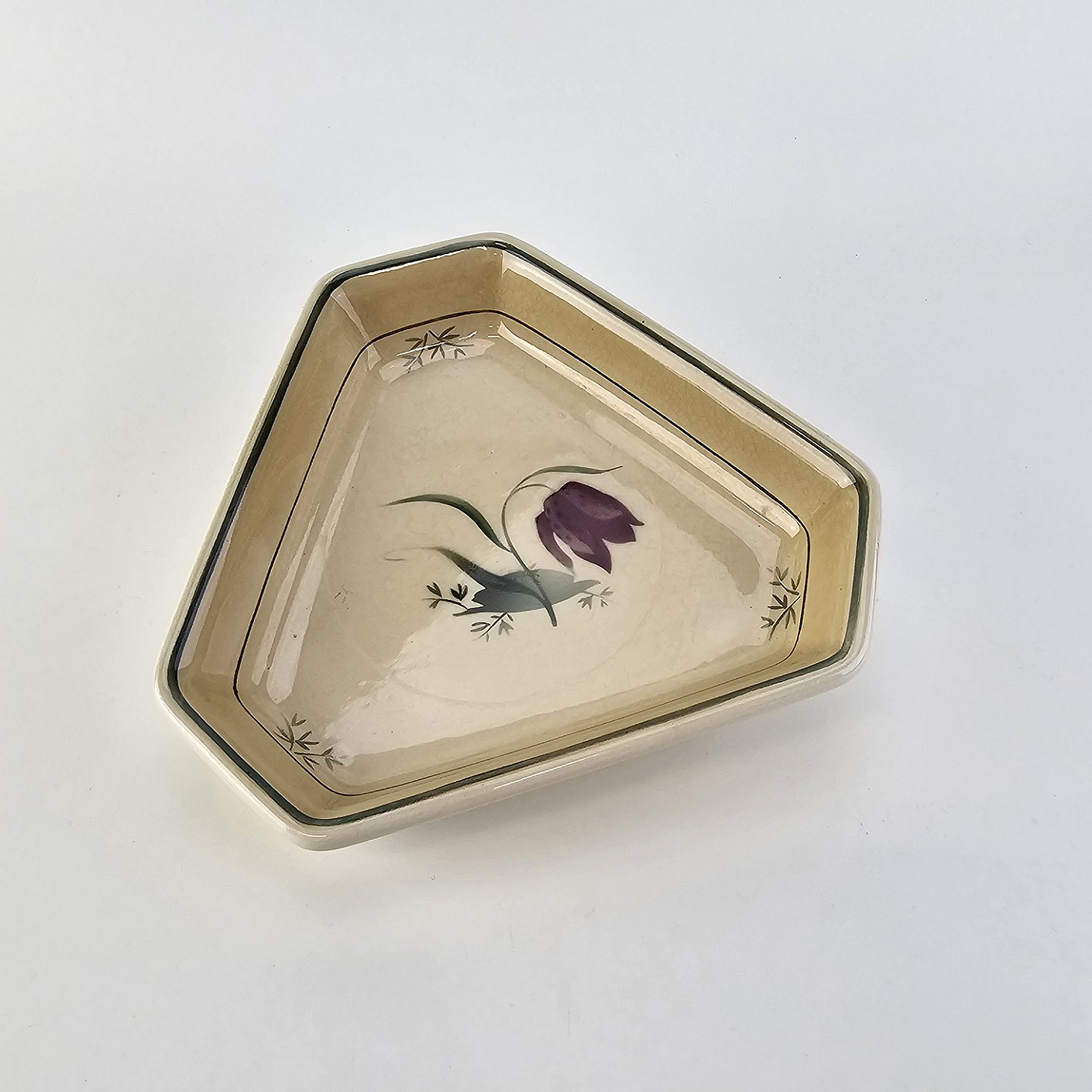 Fajancestel i stelform Viktoria II (Fletværk) med flettet kant og dekoration af en vibeæg blomst i violet og grøn, fremstillet i perioden 1934-1967
