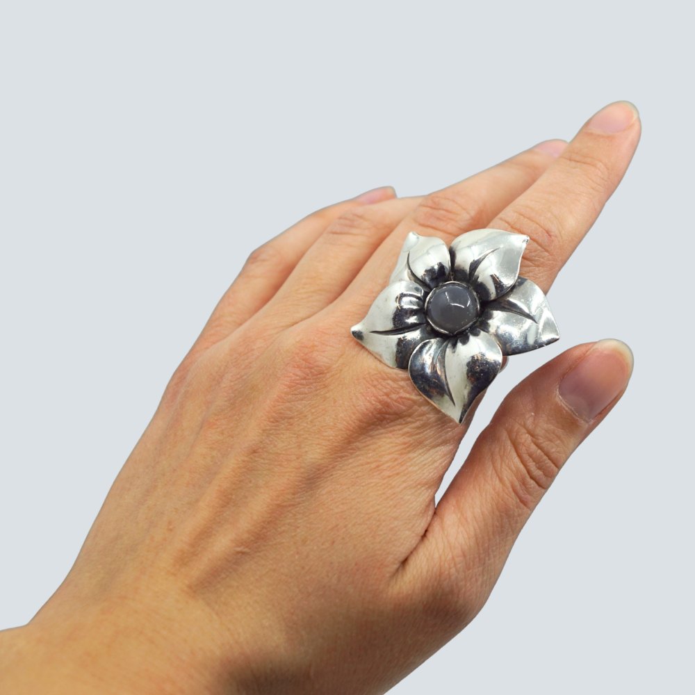 Regitze Overgaard for Georg Jensen; Blomster ring i sølv med månesten, nr. 562b. Ring str. 56.