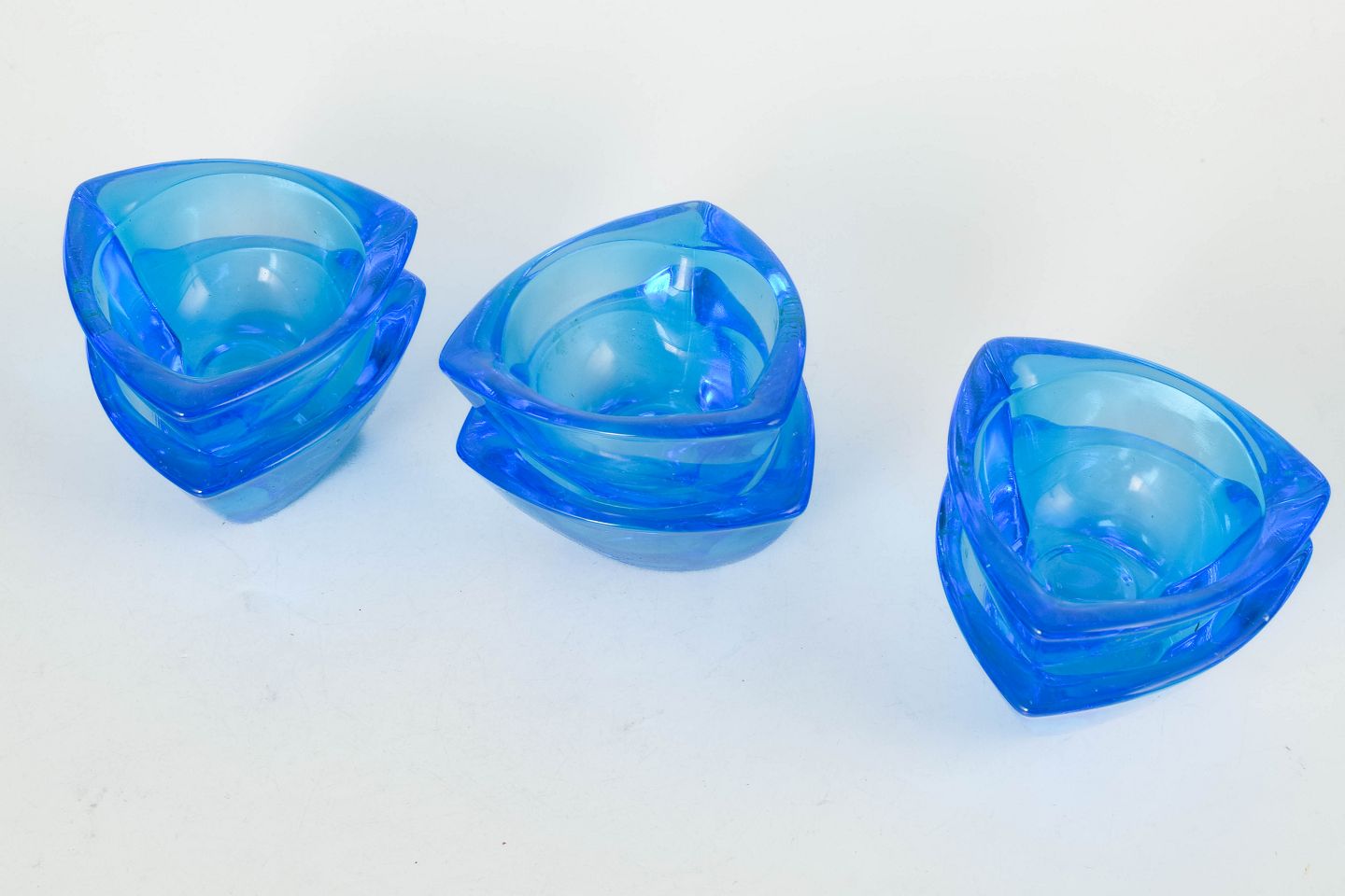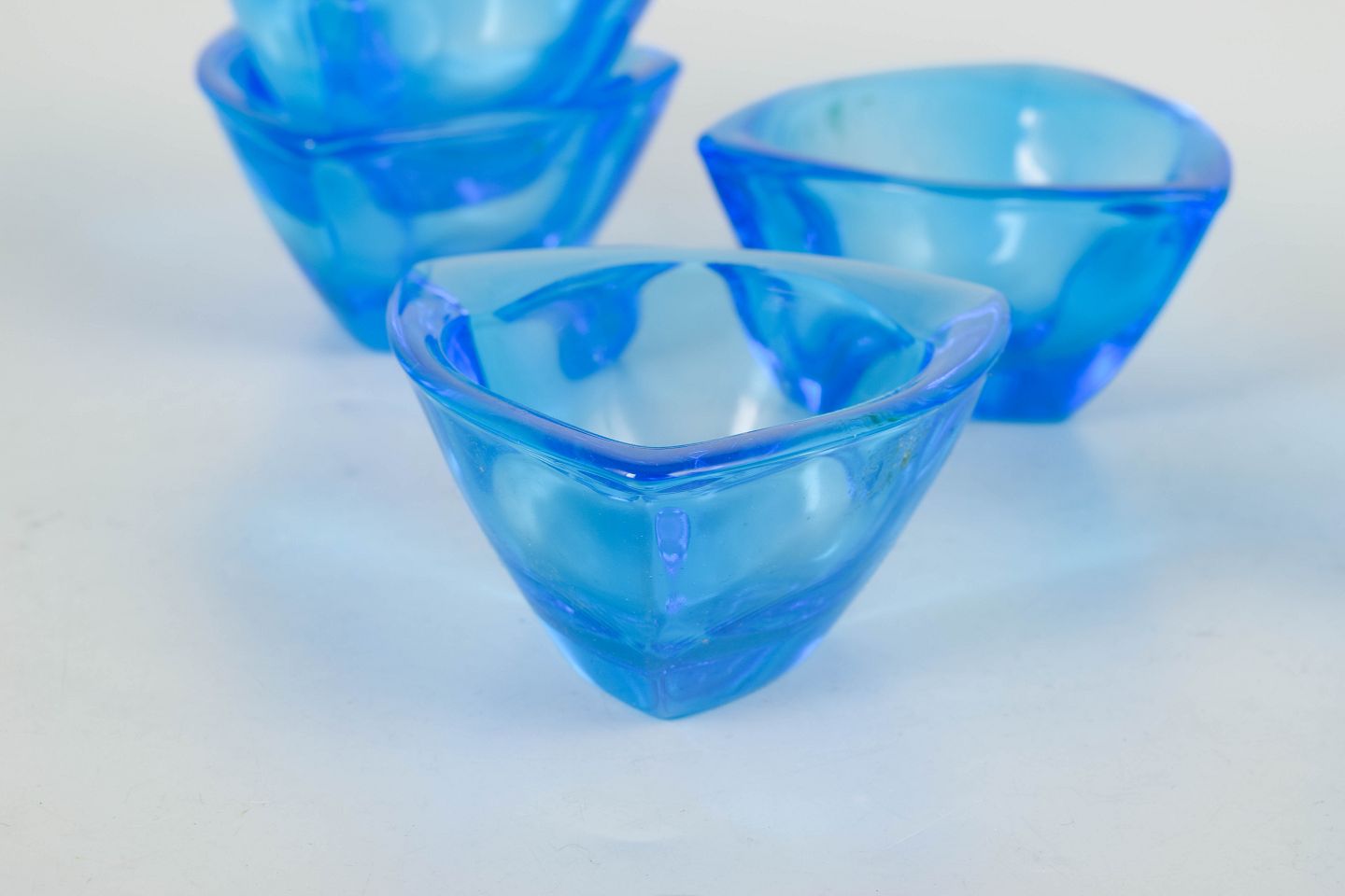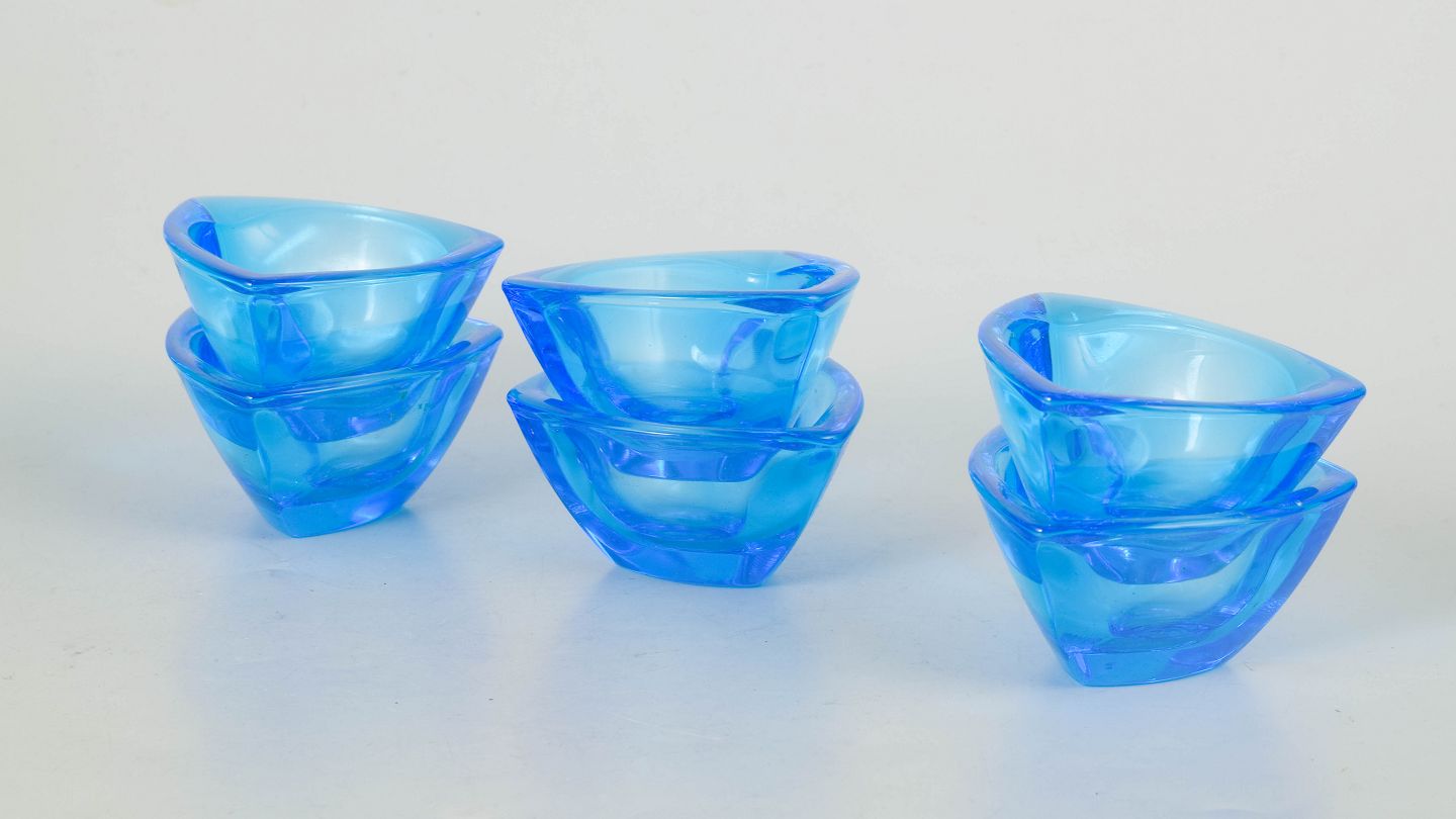 Organisk formede skåle i blåt glas, model “Bull’s eye”, med originale mærkater og æske.