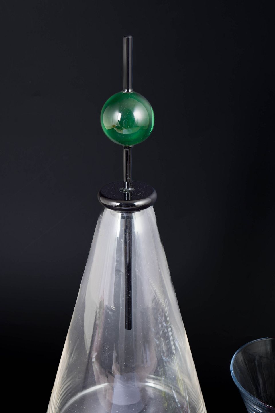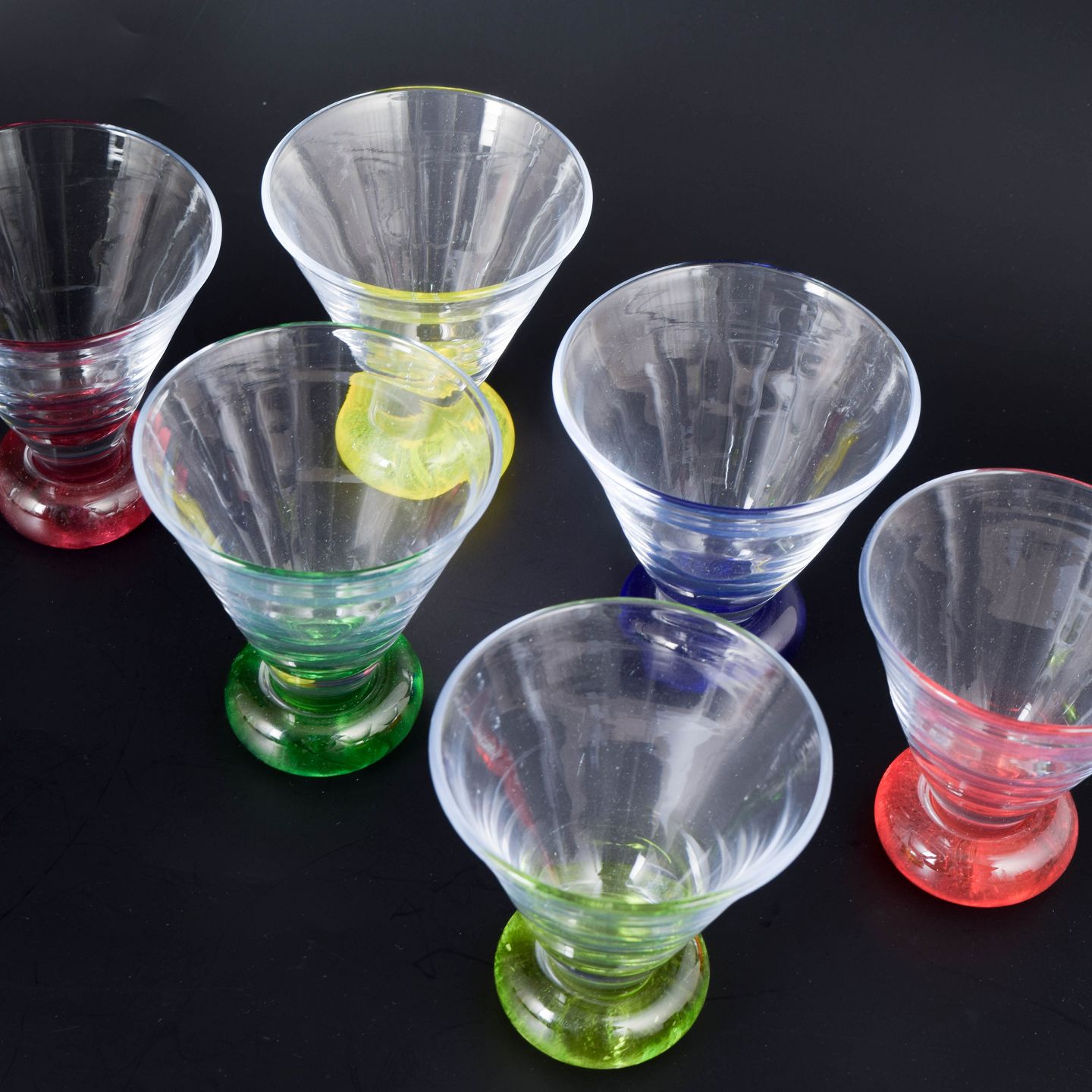 Dekorativt glas sæt i klart glas med koniske former og farvede fødder samt karaffel med kugleformet prop. Designet i en legende og geometrisk stil med tydelig inspiration fra 1980’ernes postmoderne formsprog.