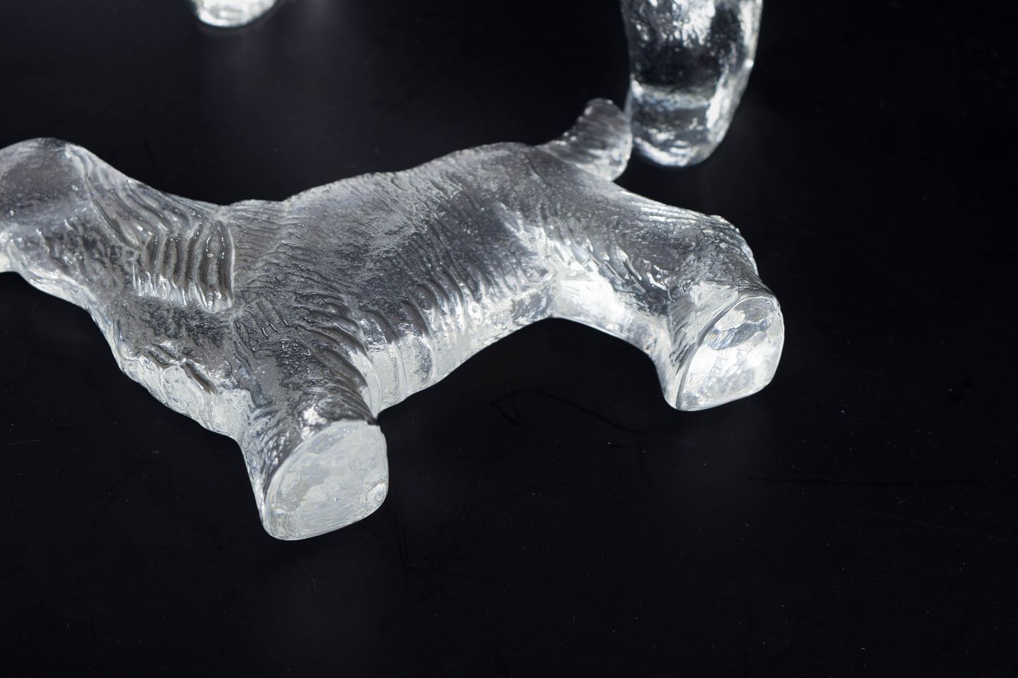 Sæt af fire skulpturelle hundefigurer i klart kunstglas med struktureret overflade, formgivet af Bertil Vallien for Kosta Boda. Figurenes organiske former og lette mattering giver et levende og karakterfuldt udtryk. Én med original æske.