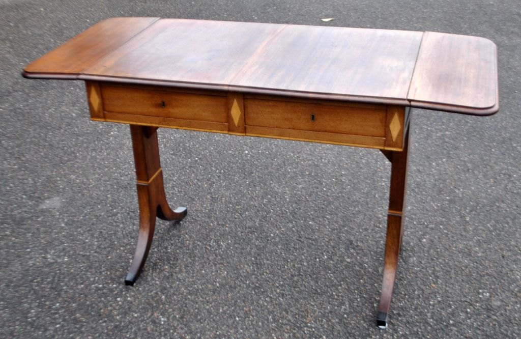 Arbejdsbord med klapper i mahogni med intarsia, ca. 1900. Danmark. Empireform. Med skuffe. L.: 88 cm. B.: 58 cm. H.: 77 cm. Opslået længde.: 132 cm.