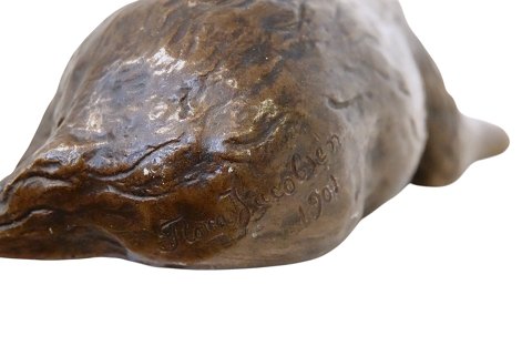 Flora Jacobsen (1863-1959), bronzefigur af hundehvalp fra 1901. Det er sandsynligvis en Golden Retriever eller en Sankt Bernhard.