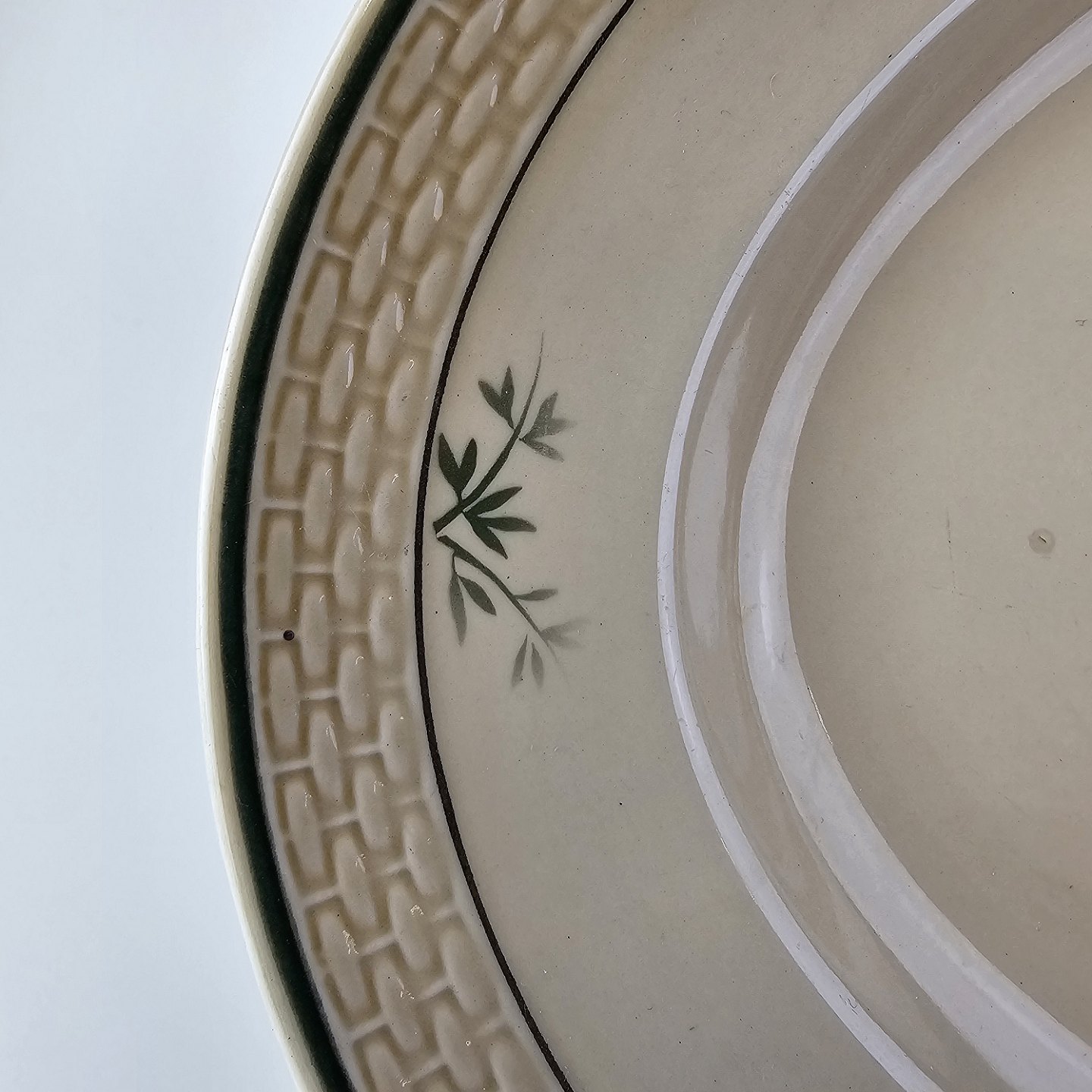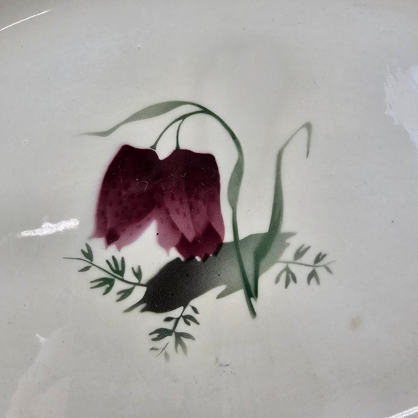 Fajancestel i stelform Viktoria II (Fletværk) med flettet kant og dekoration af en vibeæg blomst i violet og grøn, fremstillet i perioden 1934-1967
