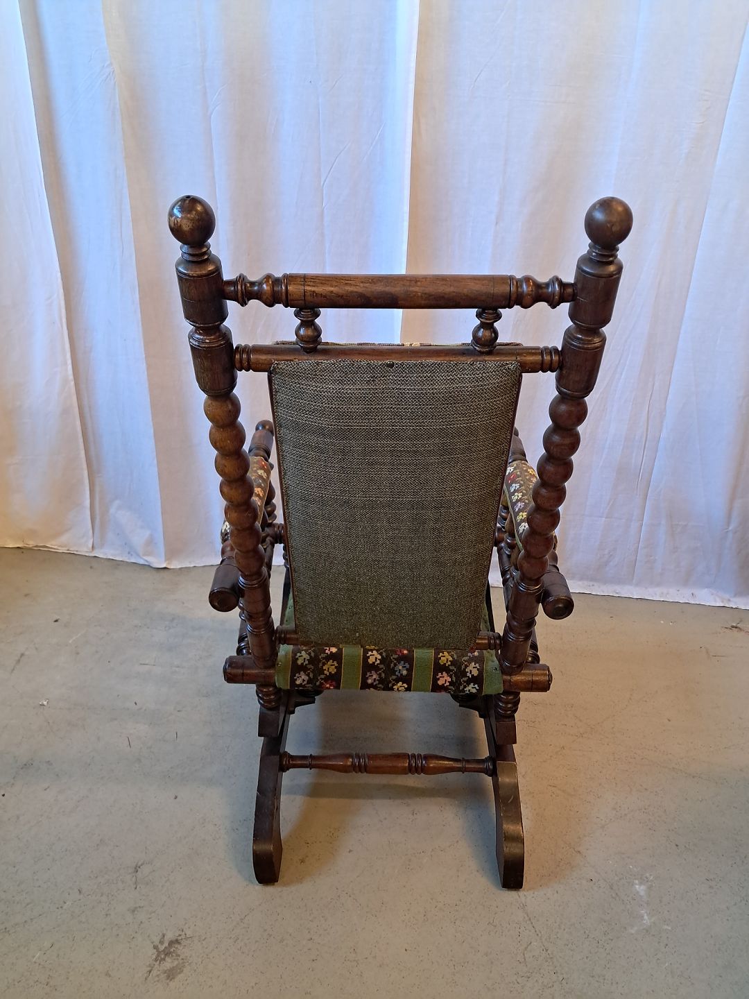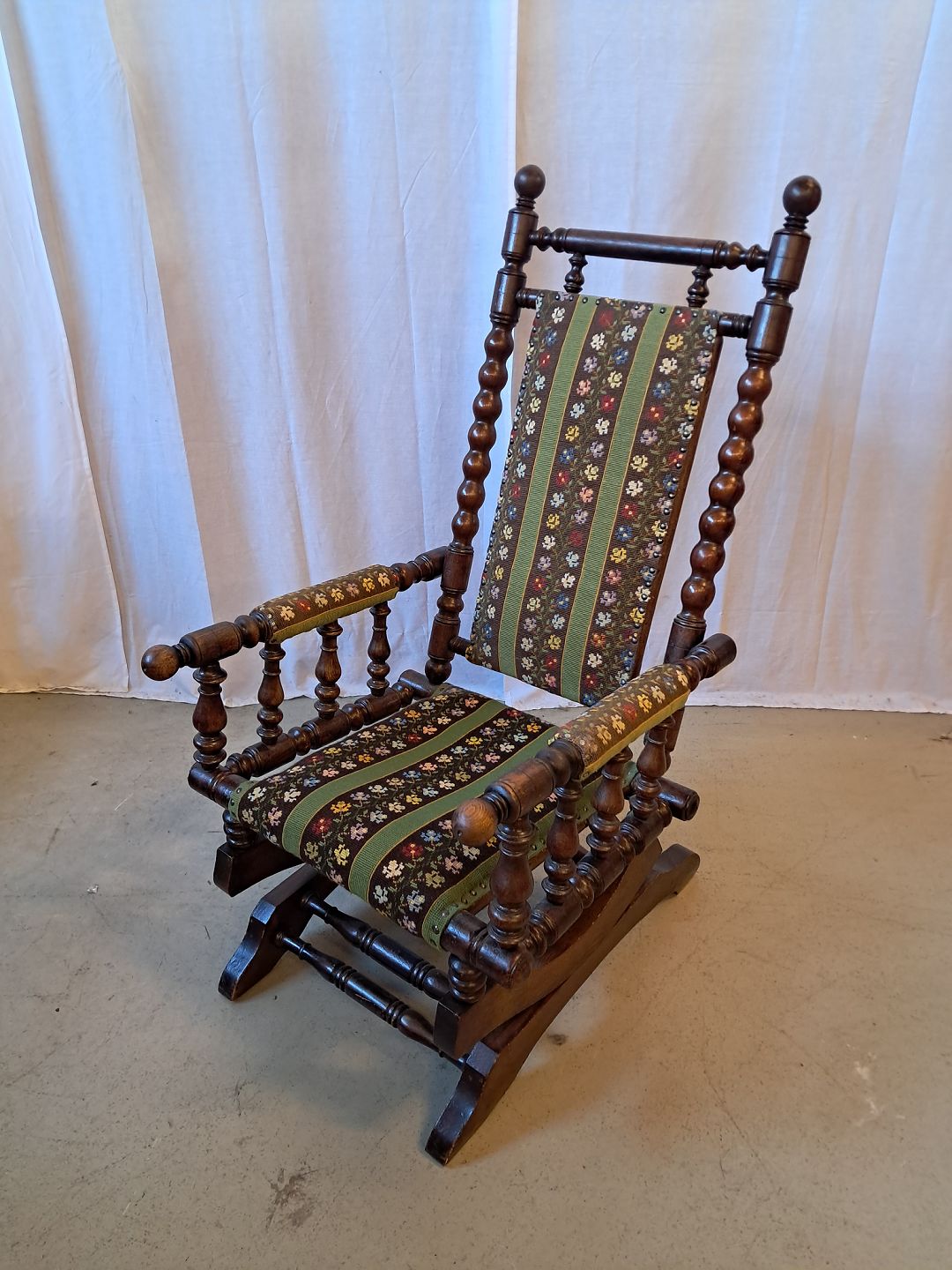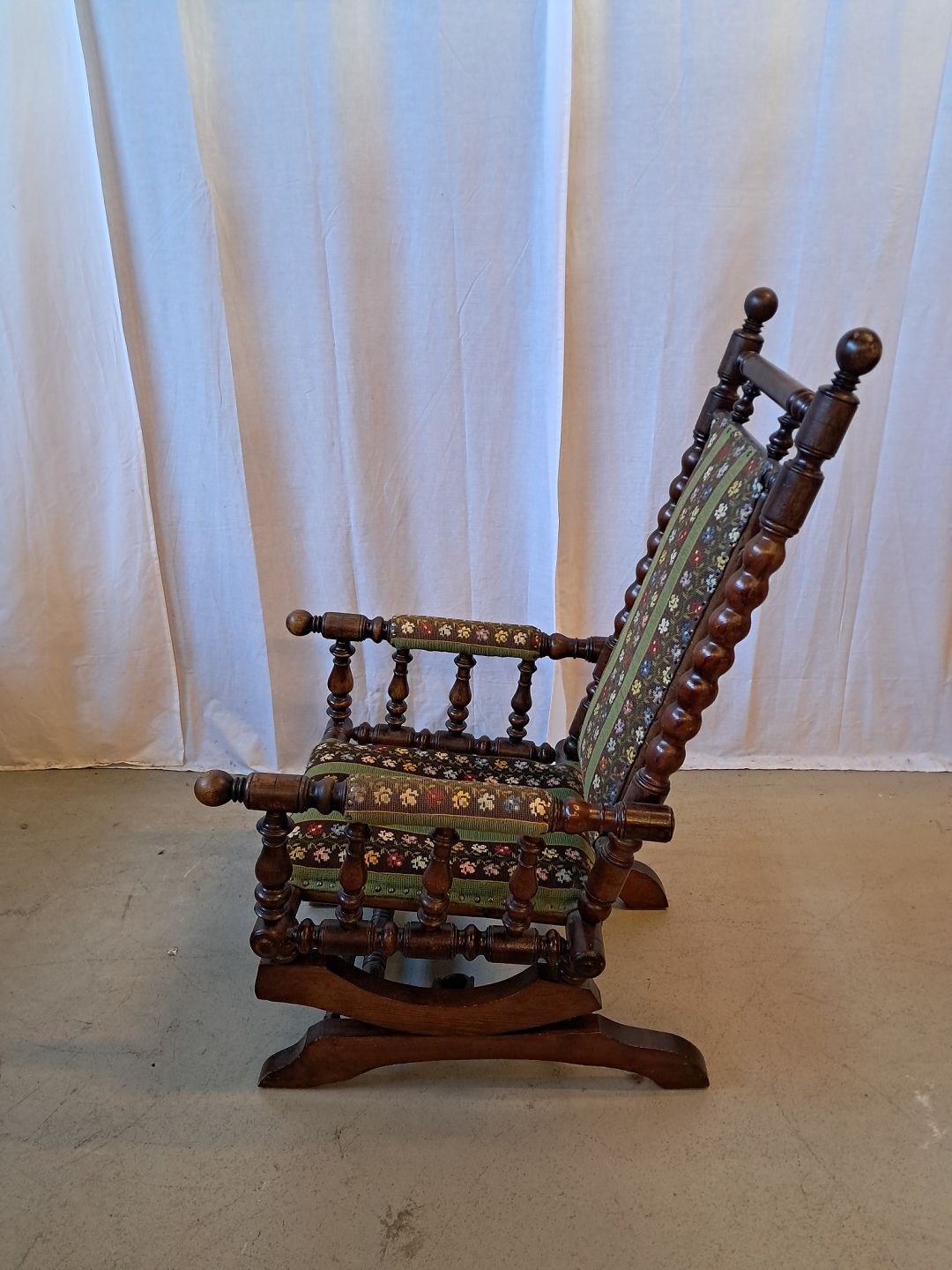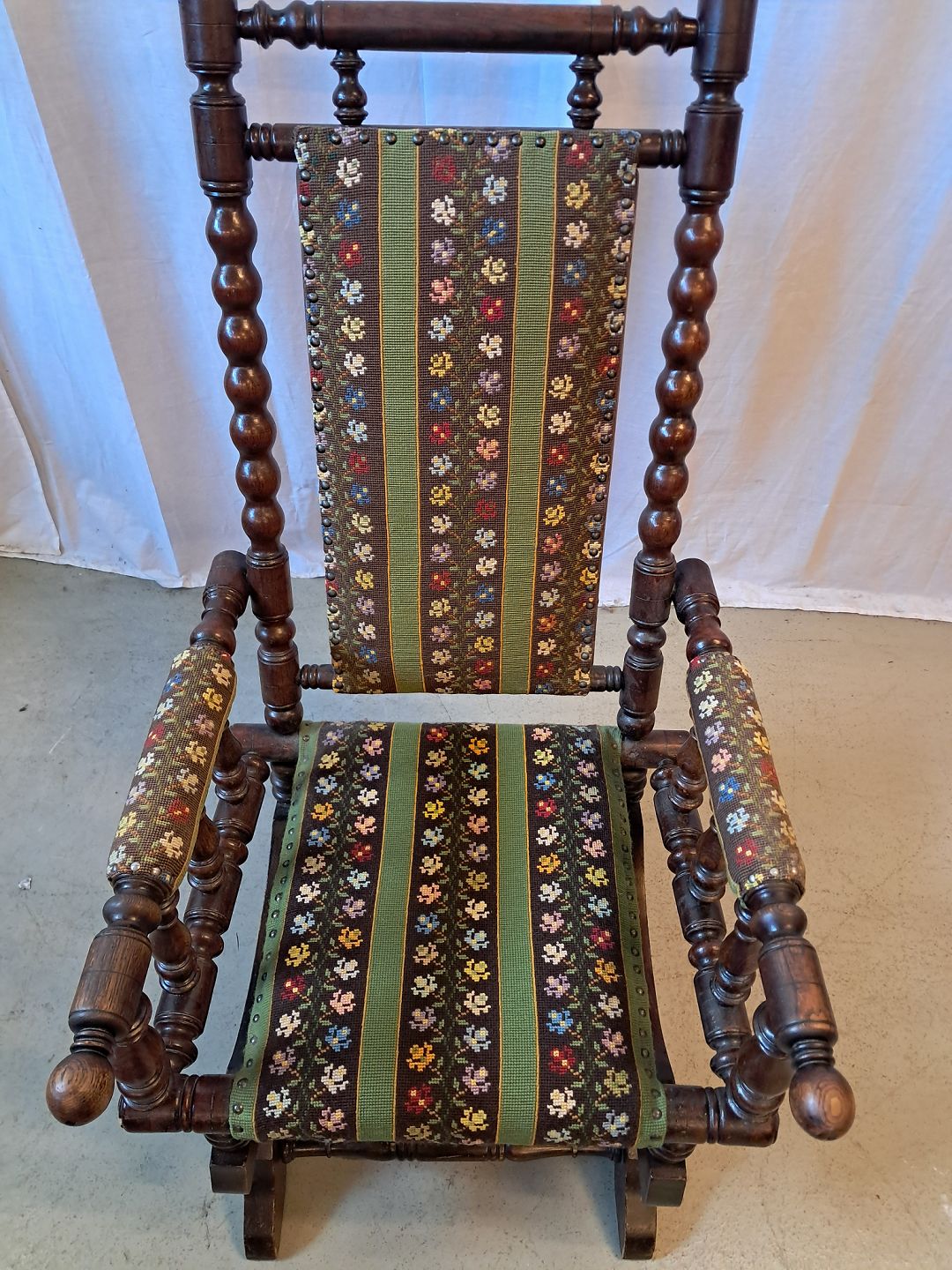 Rokkestol i massivt egetræ med broderet betræk, fra 1940erne.