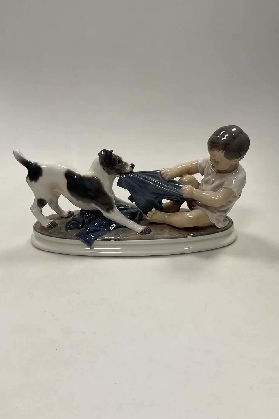Dahl Jensen Figur af Glathåret foxterrier i leg med dreng No 1072