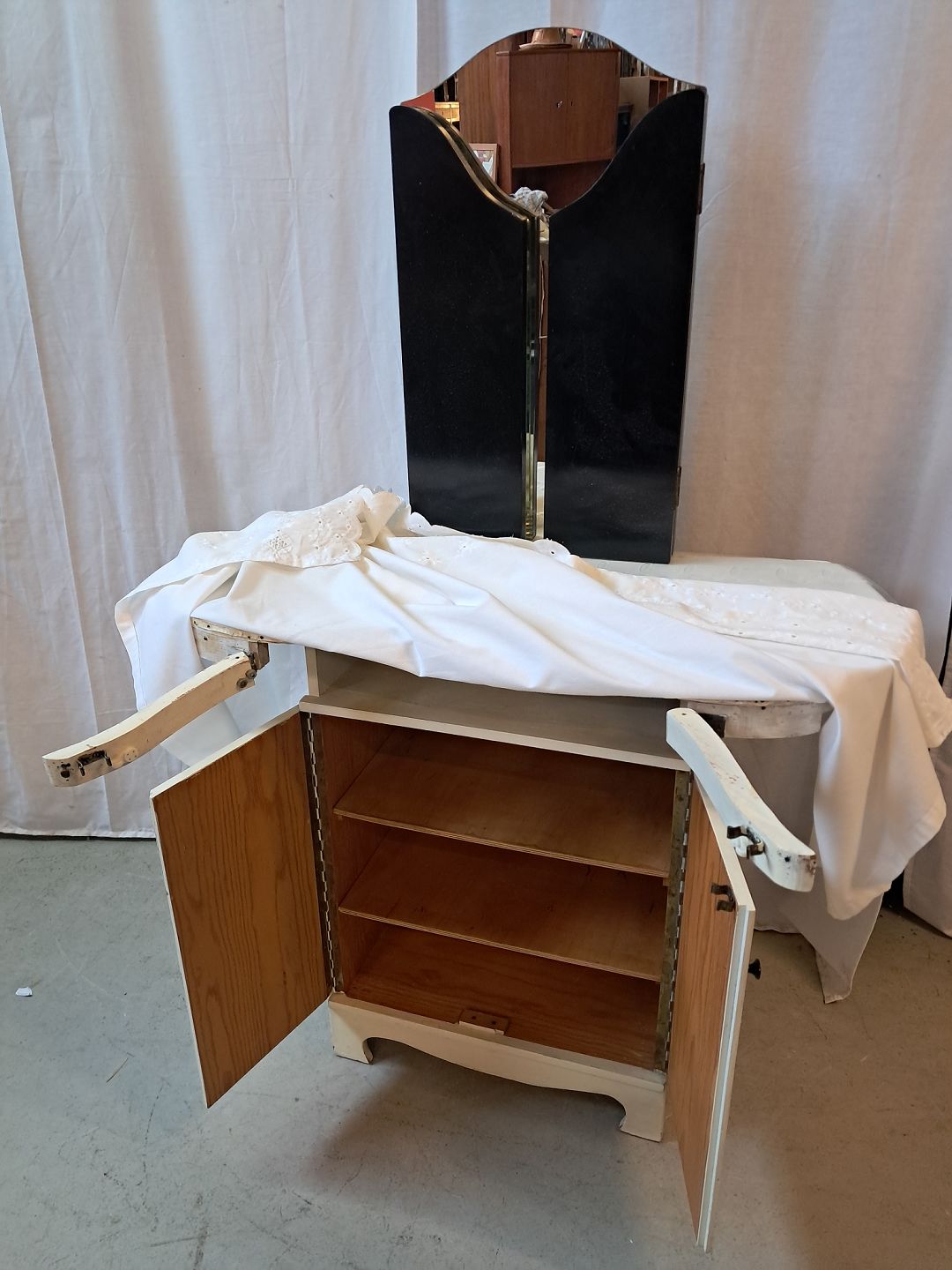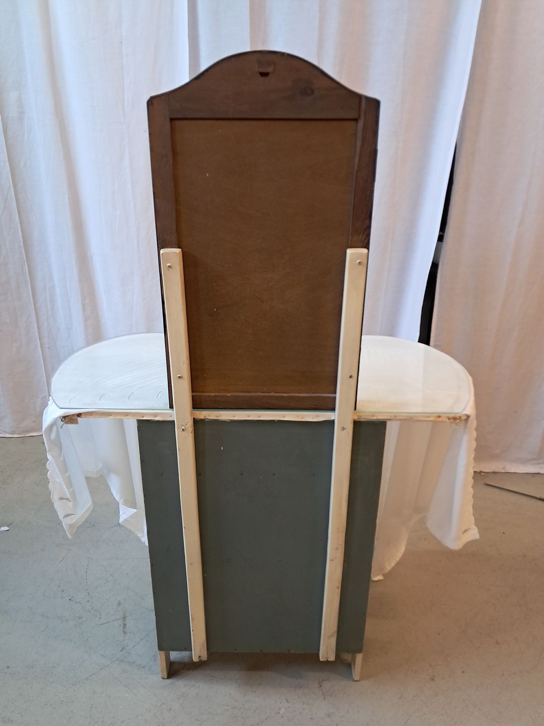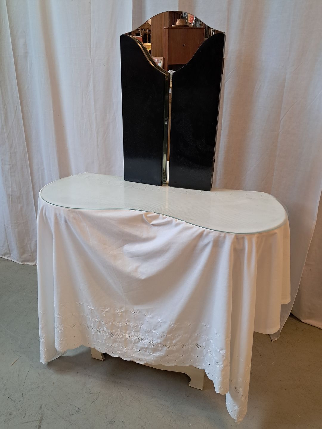 Marie Antorinette sminkebord med spejl og glasplade, fra 1950erne.