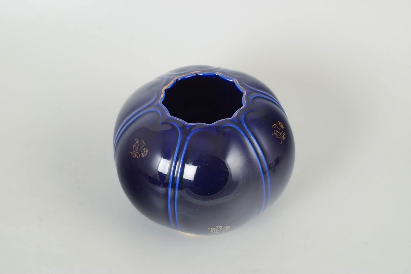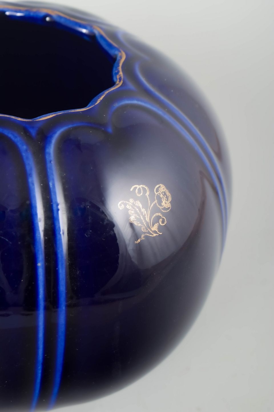 Kugleformet vase i porcelæn med dyb koboltblå glasur, dekoreret med lodrette linjer og guldkant ved foden.
