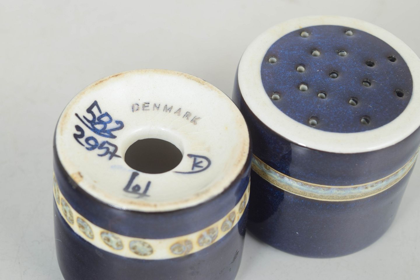 Porcelæn salt- og pebersæt fra 1956, model 582/2957, udført i kompakt cylindrisk form med dyb blå glasur og dekorative bånd med stiliseret motiv.