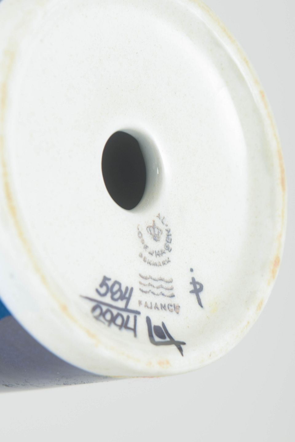 Porcelæn sukkerstrøer fra 1956, model 584/2994, udført i cylindrisk form med dyb blå glasur og dekorative bånd med stiliseret motiv.
