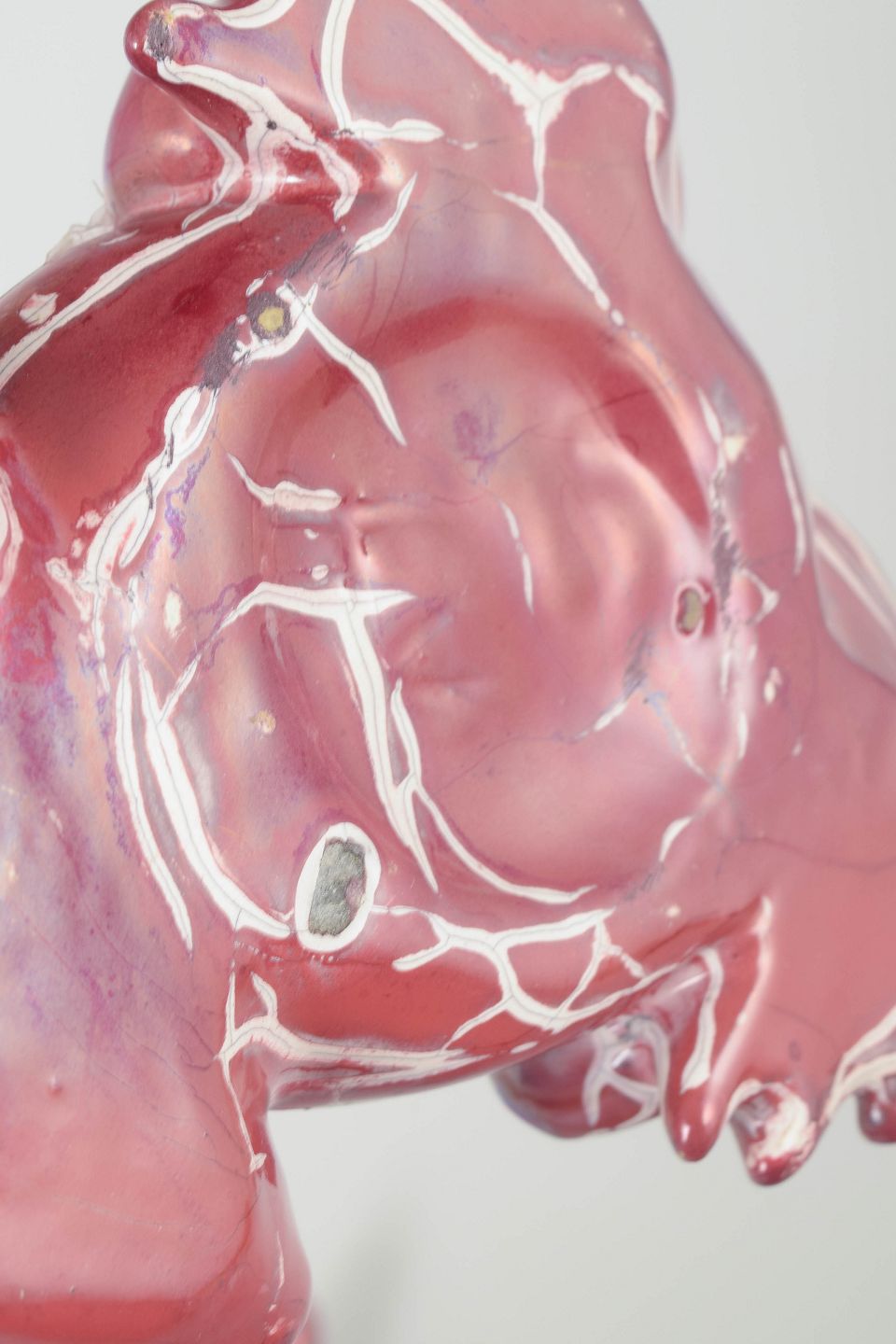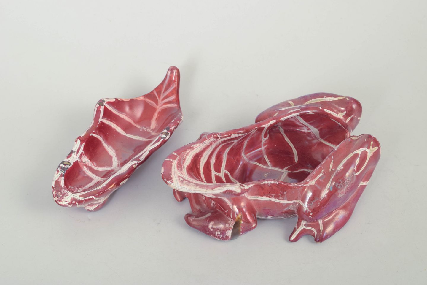 Naturalistisk formet frø udført i glaseret keramik med låg, dekoreret i dyb rosa glasur med lyse krakeleringer. Model fremstår som en dekorativ og funktionel opbevaringsgenstand fra Kählers kunstneriske produktion i slutningen af 1800-tallet.