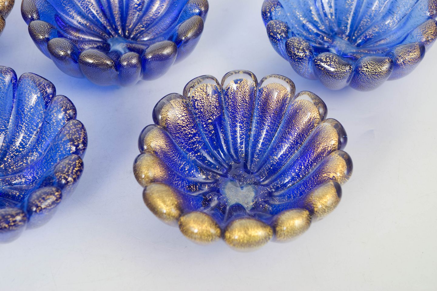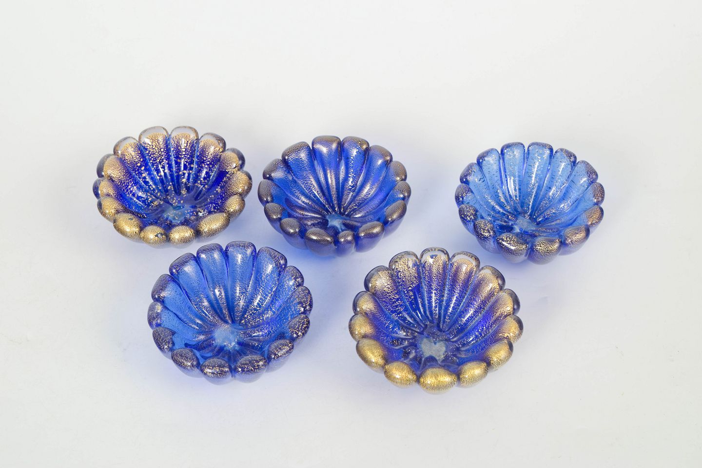 Fem små skåle i formpresset glas med rillet, bølget form og dekorativ overflade i blå og gyldne toner.