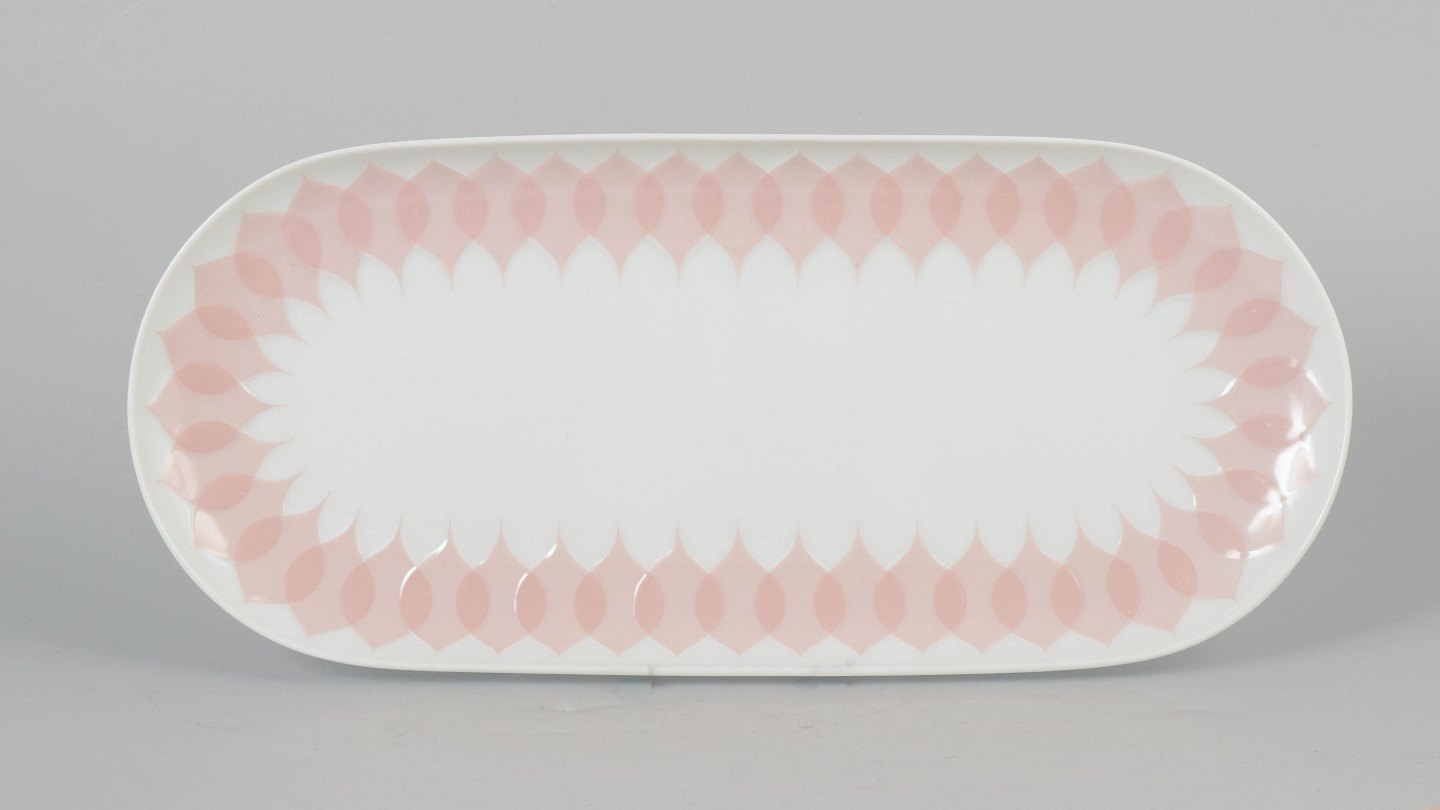 Dekorativt ovalt porcelænsfad med karakteristisk rosa “Lotus” dekoration langs kanten, udført i et gentaget bladmotiv med bløde overgange og grafisk rytme.