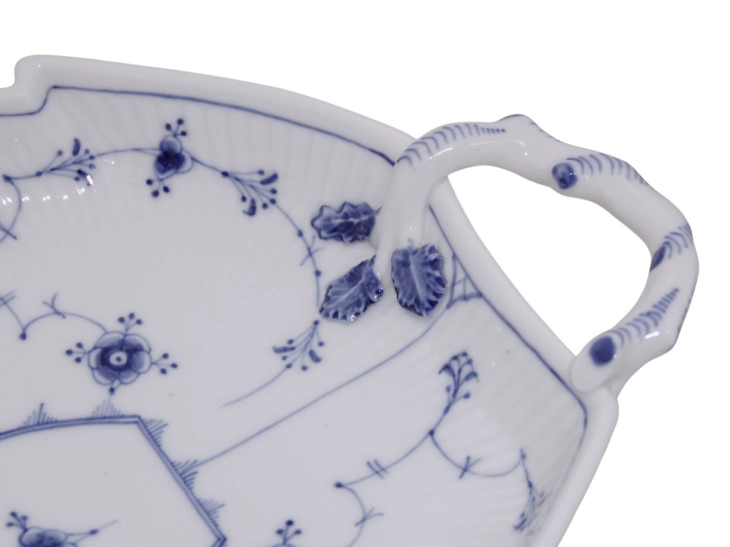 Royal Copenhagen Musselmalet Riflet, stort kagefad med sjældent set blade i relief.