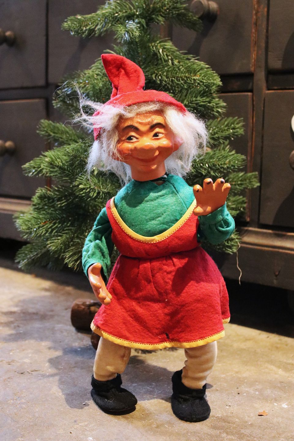 2 gamle butiksnisser med filt tøj og ansigt i bemalet papmache. (Nissemor og Nissefar) Højde: 40cm. Sælges enkeltvis ! Emne nummer: Nisse mor & far