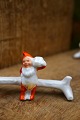 Gamle svenske jule knivstol i porcelæn med lille nisse siddende på træstamme til at lægge sit bestik på.