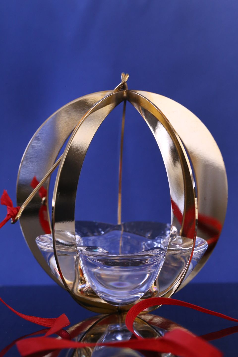 Description: Beautiful and elegant Christmas mobile with tealight holder from Danish Holmegaard. The classic Golden Christmas theme is always beautiful at Christmas time and brings warmth into the home. This Christmas mobile is especially beautiful because the light from the tealight is reflected in the golden arches, giving a beautiful and warm glow.