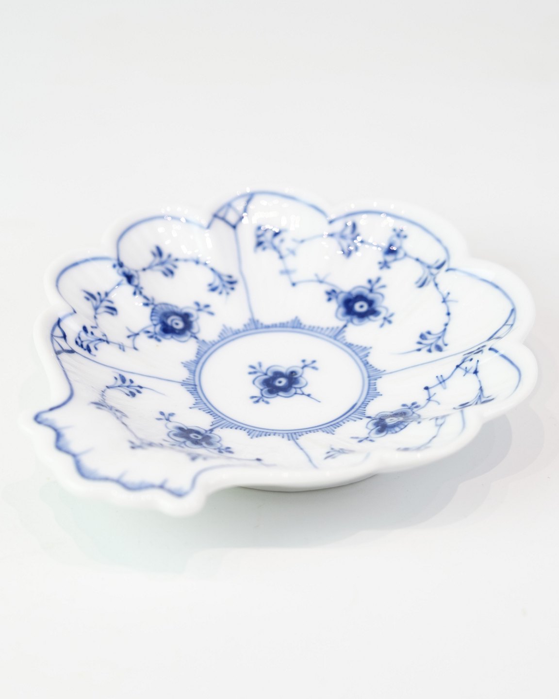 Description: The dish in the classic blue-fluted pattern from Royal Copenhagen. This small serving bowl, model no. 2013, is hand-painted and dates from the period 19231935, which is confirmed by the stamp. The shape is slightly oval and has the characteristic blue-white porcelain.