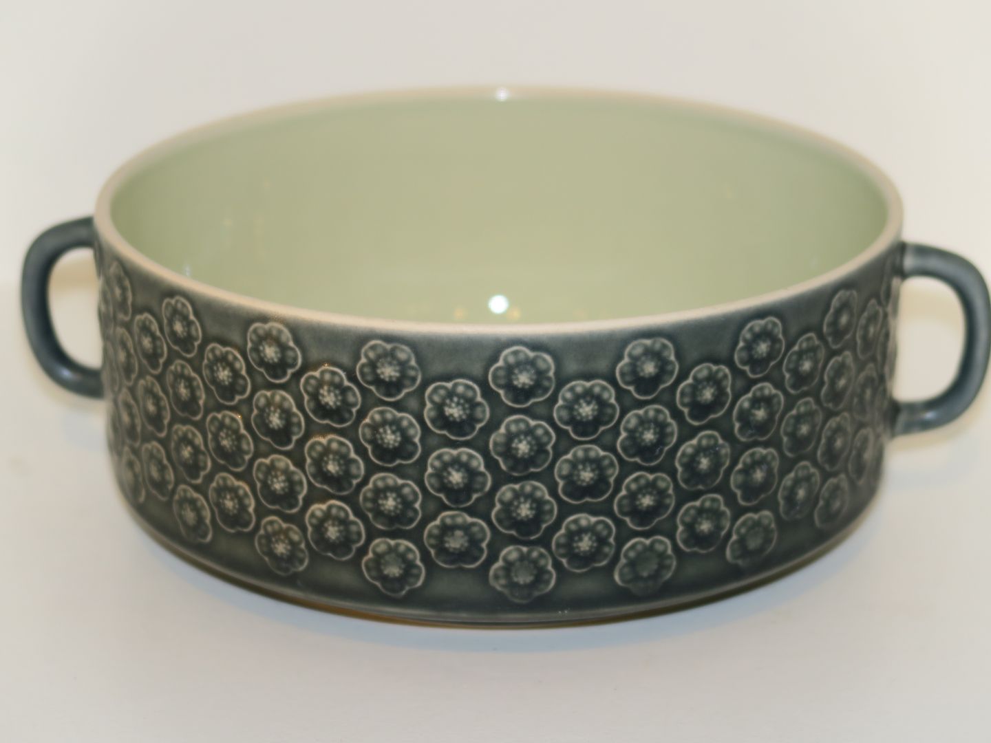 Description: Kronjyden Azur stoneware, bowl with handles that is missing a lid.