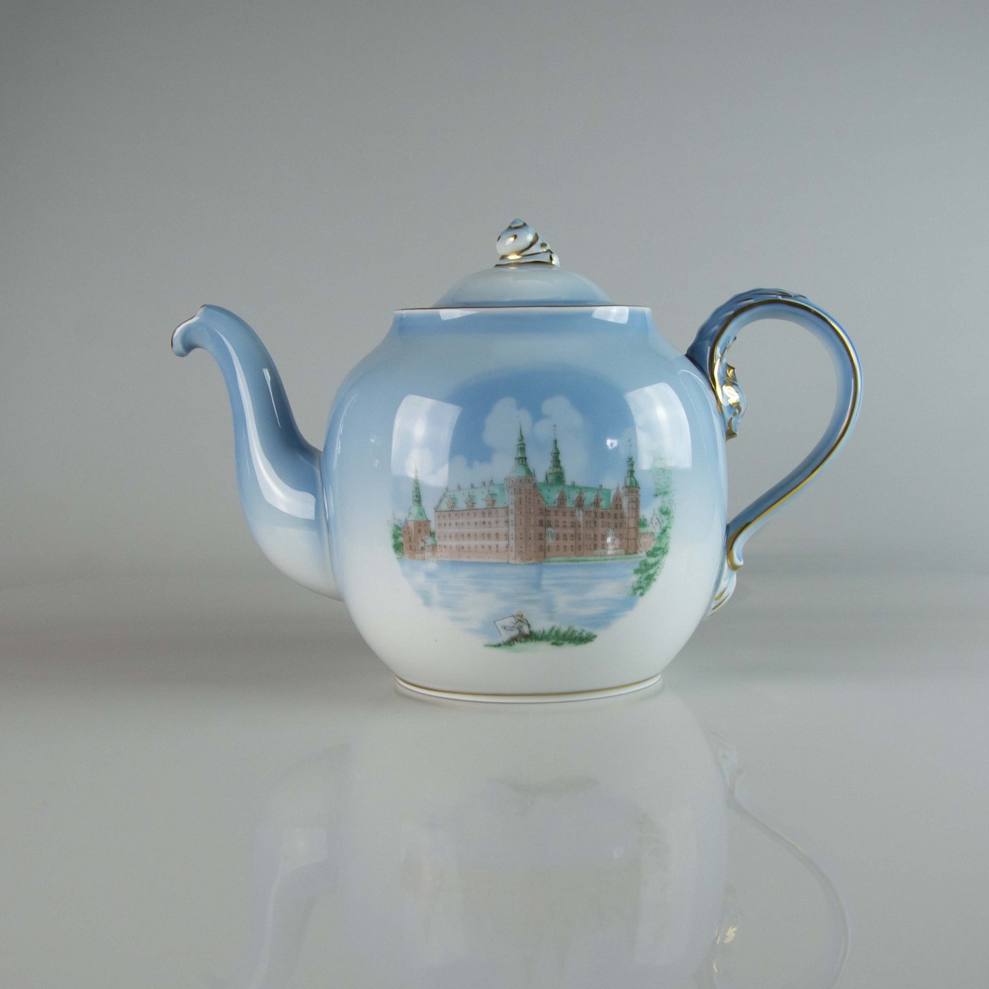 Beskrivelse: Tekande i porcelæn fra Danmarksstellet med guldkant og motiv af Kronborg. Nr. 656/3562