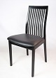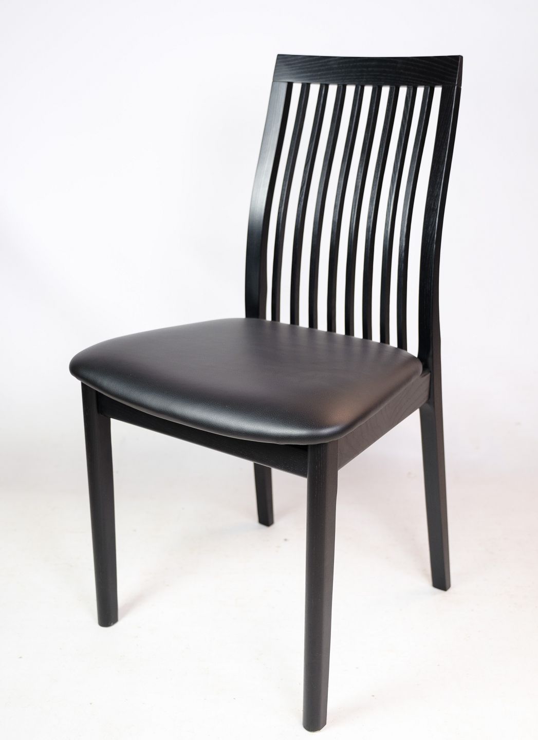 Description: Set of 4 dining chairs, model 712, in black stained ash manufactured by K. Høffer Larsen A/S. Medium-height dining chair, with vertical sticks in the back, which provides good sitting comfort.