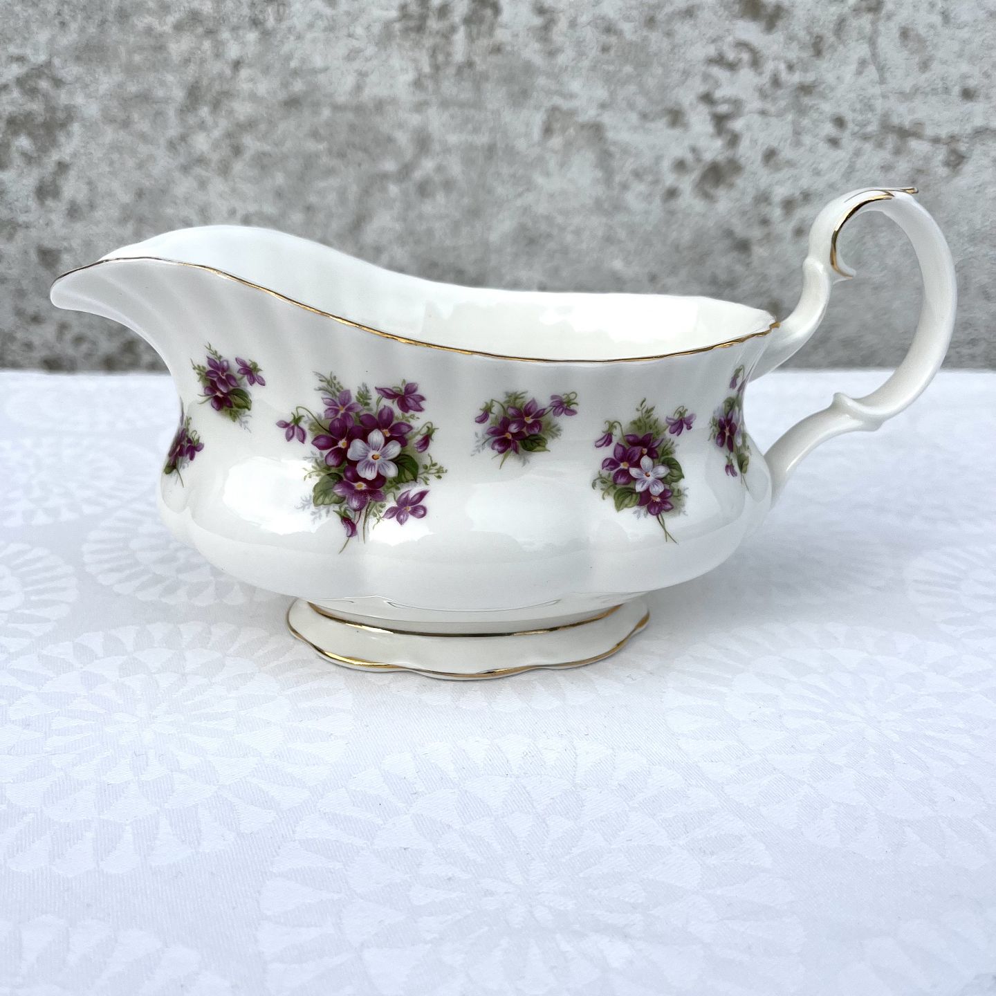 Description: Royal Albert, Bone China, Sweet violets, Field violet, Sauce jug, 20cm long, 9cm wide, 9cm high *Perfect condition*