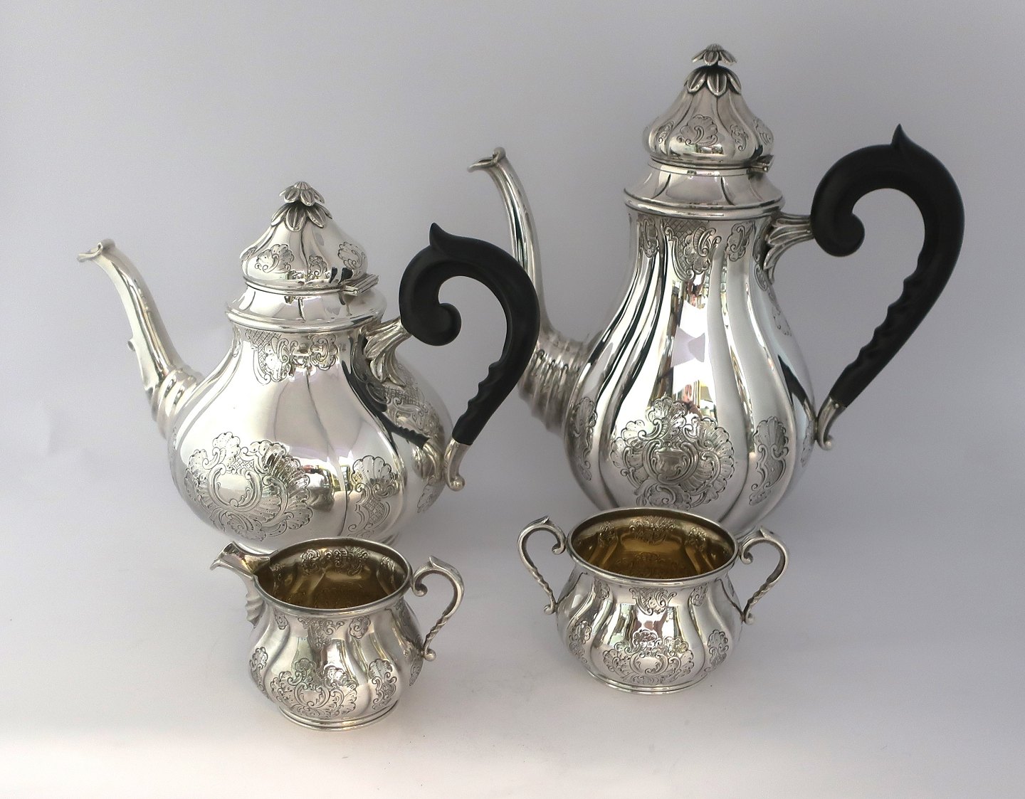 Description: Svend Toxvärd. Silver tea & coffee service (830). Consisting of teapot, coffeepot, sugar bowl and creamer. Height of the coffee pot 24.5 cm.
