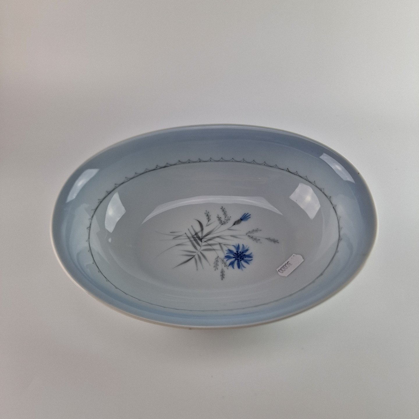 Beskrivelse: Oval skål fra stellet Demeter Blå. No 12 B