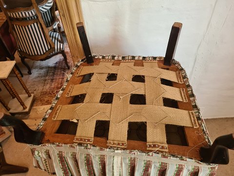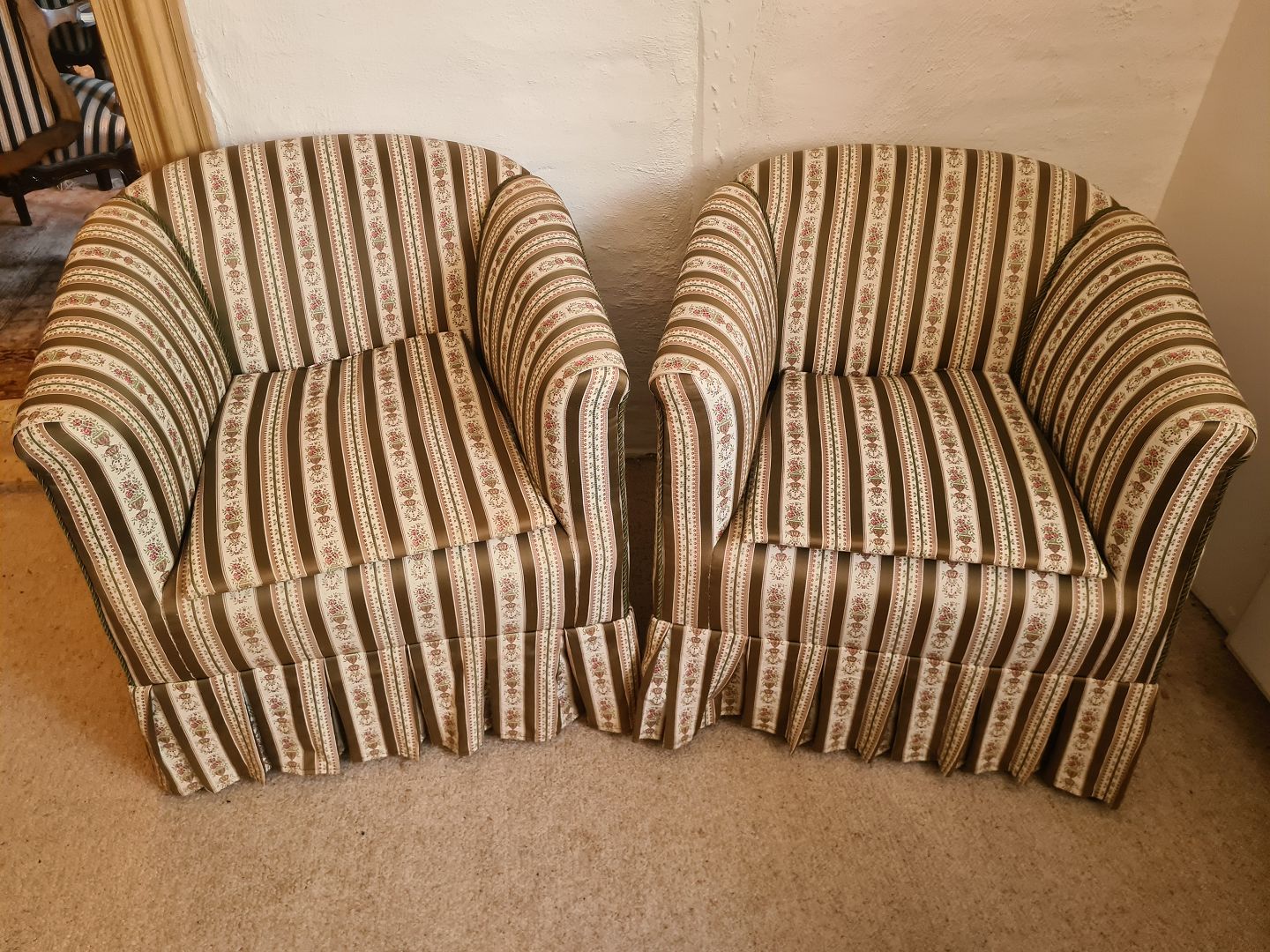 Beskrivelse: Par overpolstrede lænestole fra 1950'erne. Fremstår pæne og velholdte uden nævneværdige brugsspor.