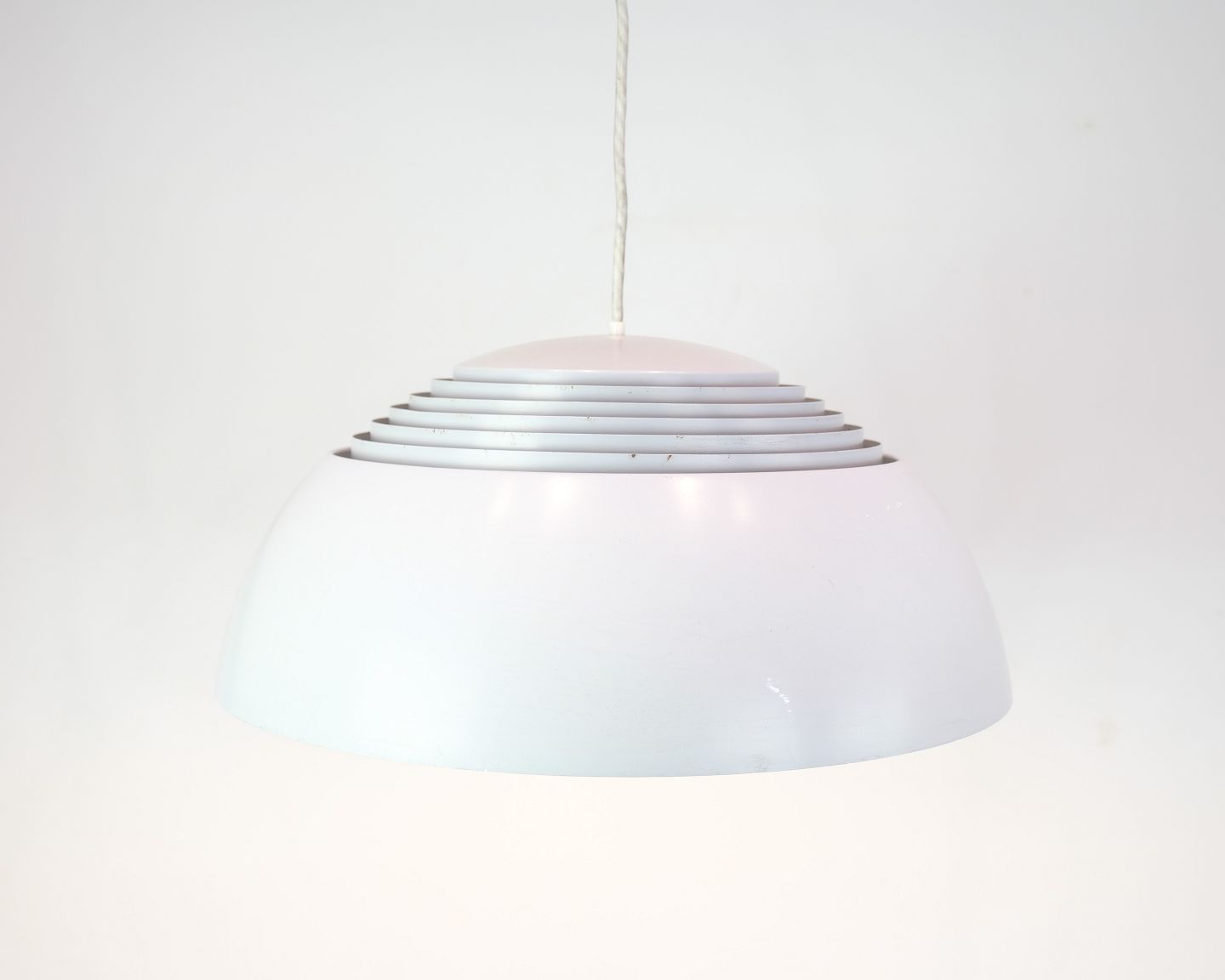 Description: The AJ Royal pendant lamp was designed by Arne Jacobsen in 1957 as part of the overall design concept for the then SAS Royal Hotel in Copenhagen. Production was started shortly afterwards by Louis Poulsen, who continues to manufacture the lamp today. This version is in grey with a white cord.