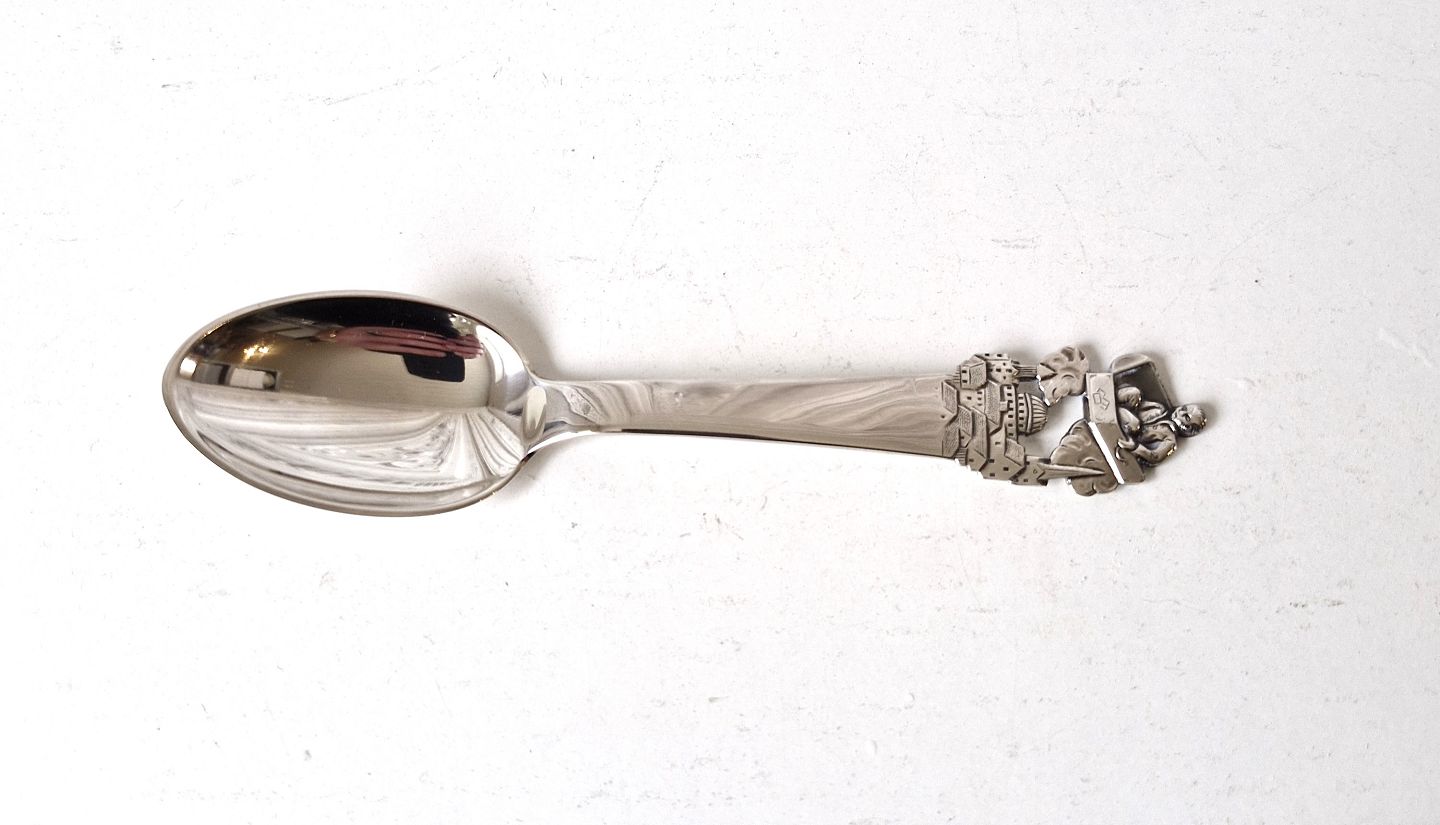 Description: H.C.Andersen children's spoon in silver - "The Flying Suitcase"Stamp: HS - 830s