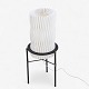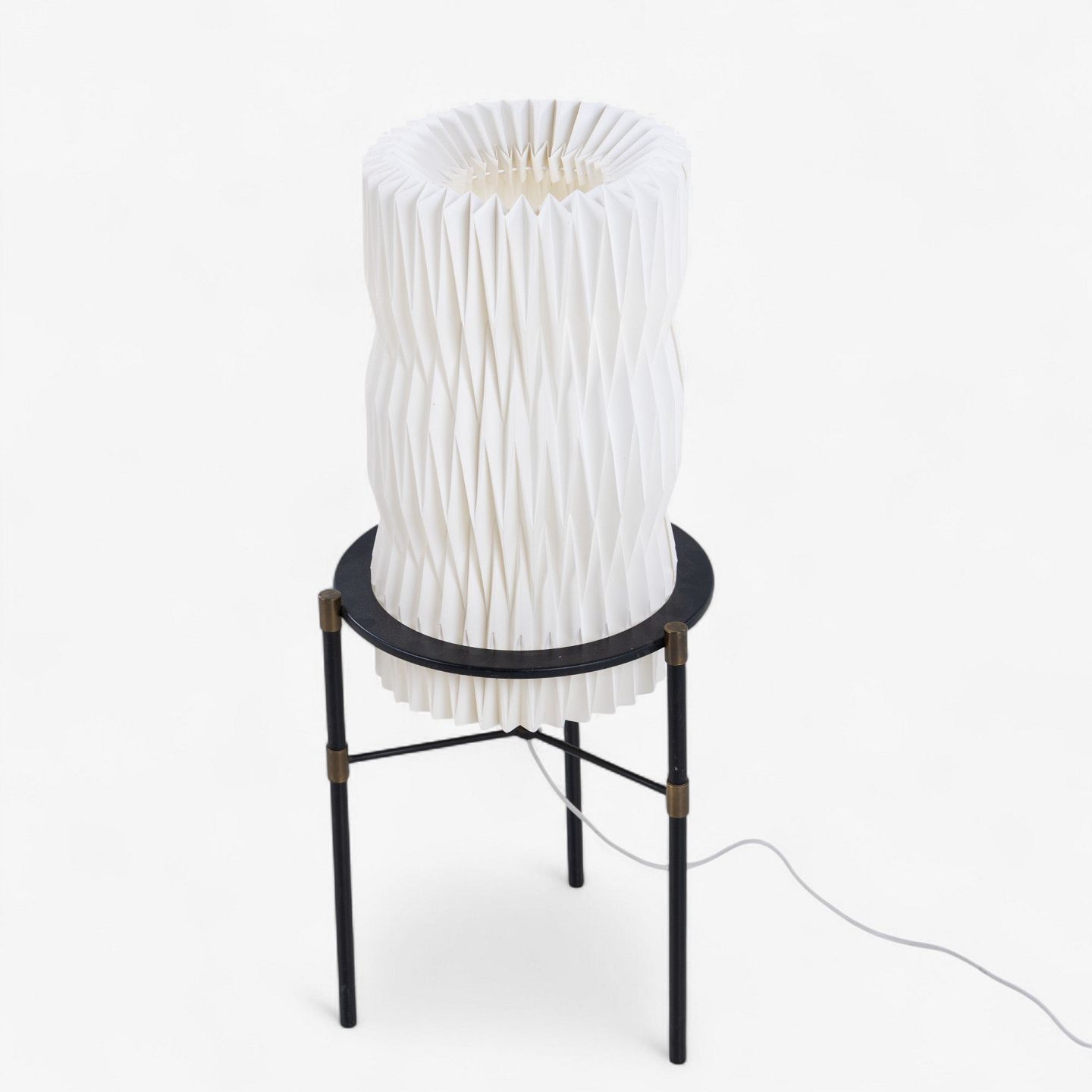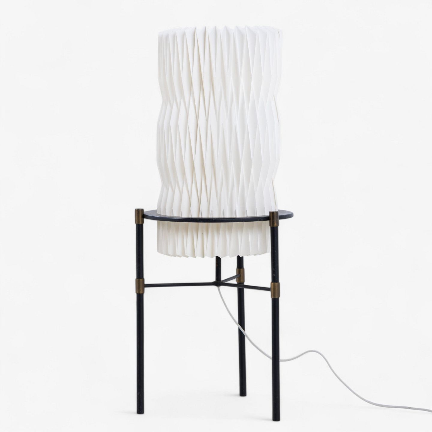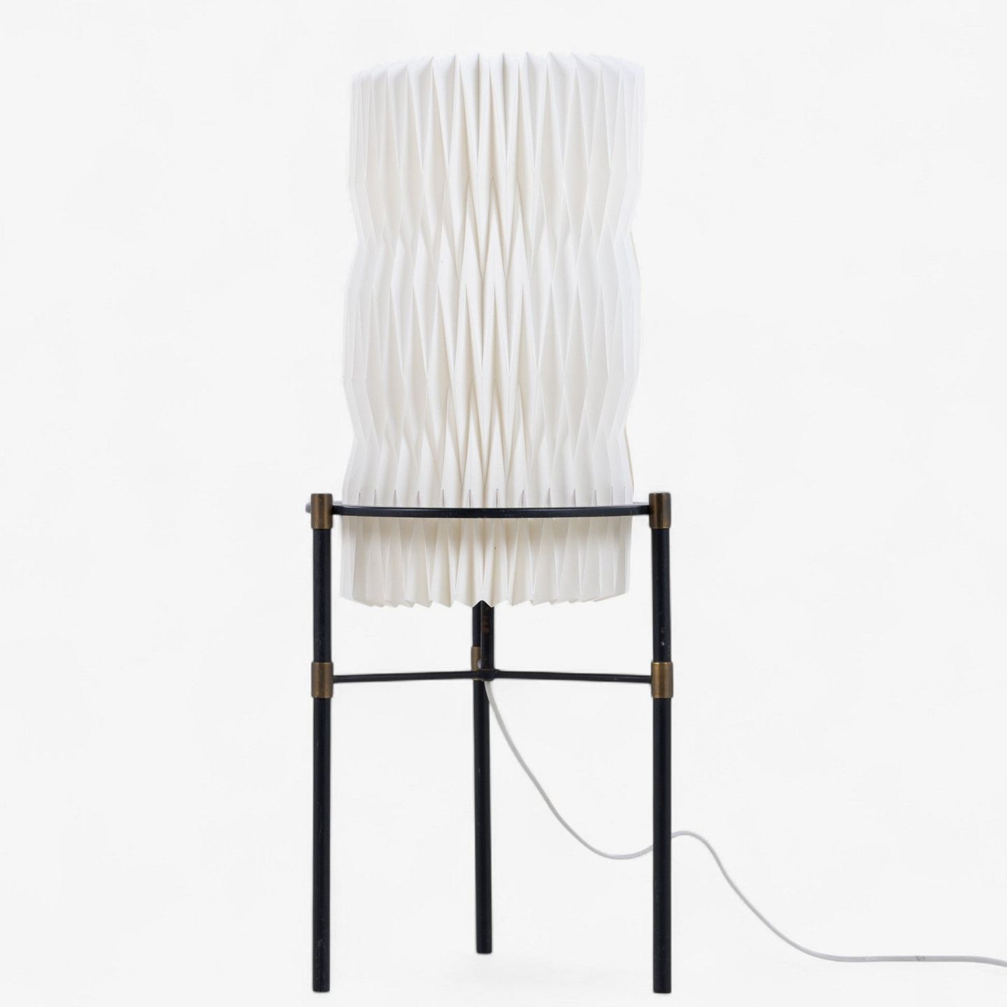 Pair of table lamps on tripod base in black lacquered metal with white pleated shades.