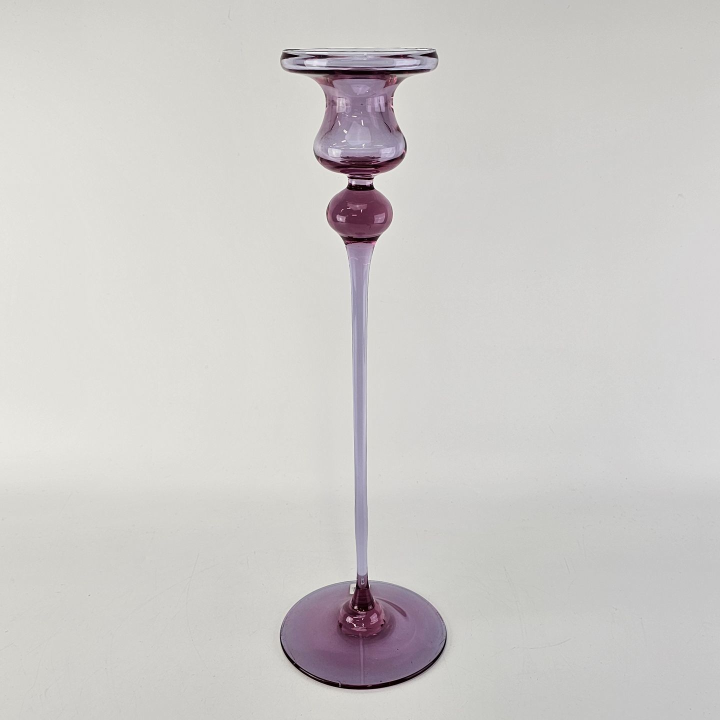 Beskrivelse: Lysestage i klart lilla glas. Model Cassiopeia
