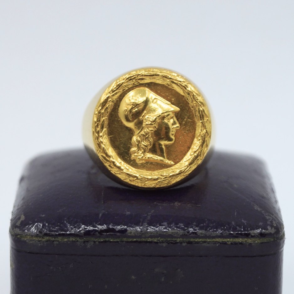 Description: Frantz Hingelberg; Danish doctoral ring of 14k gold. Front in 23k gold with motif of Minerva surrounded by a laurel wreath.The motif of Athena/Minerva, the Greco-Roman goddess of science, has been used for doctoral rings in Denmark since 1866.