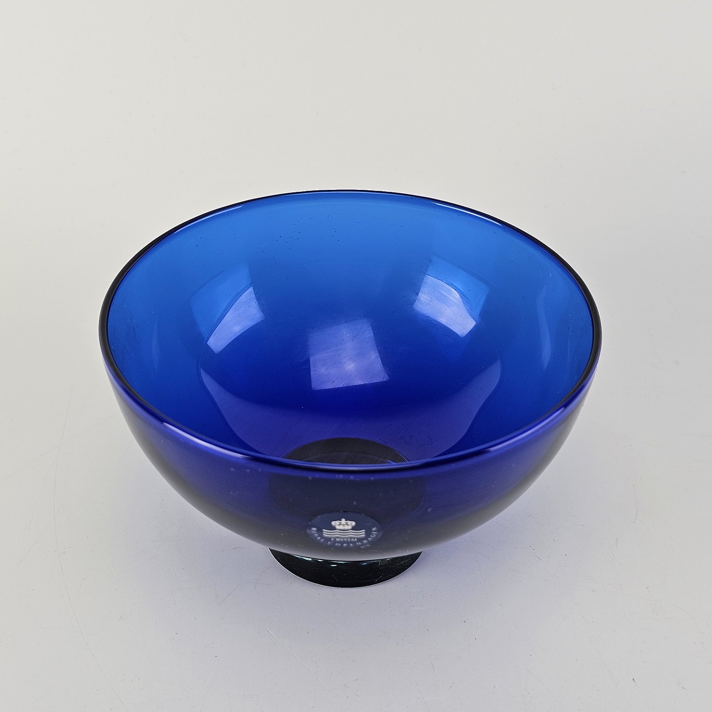 Beskrivelse: Harlekin skål i gennemsigtigt blåt glas med klart glas i bunden
