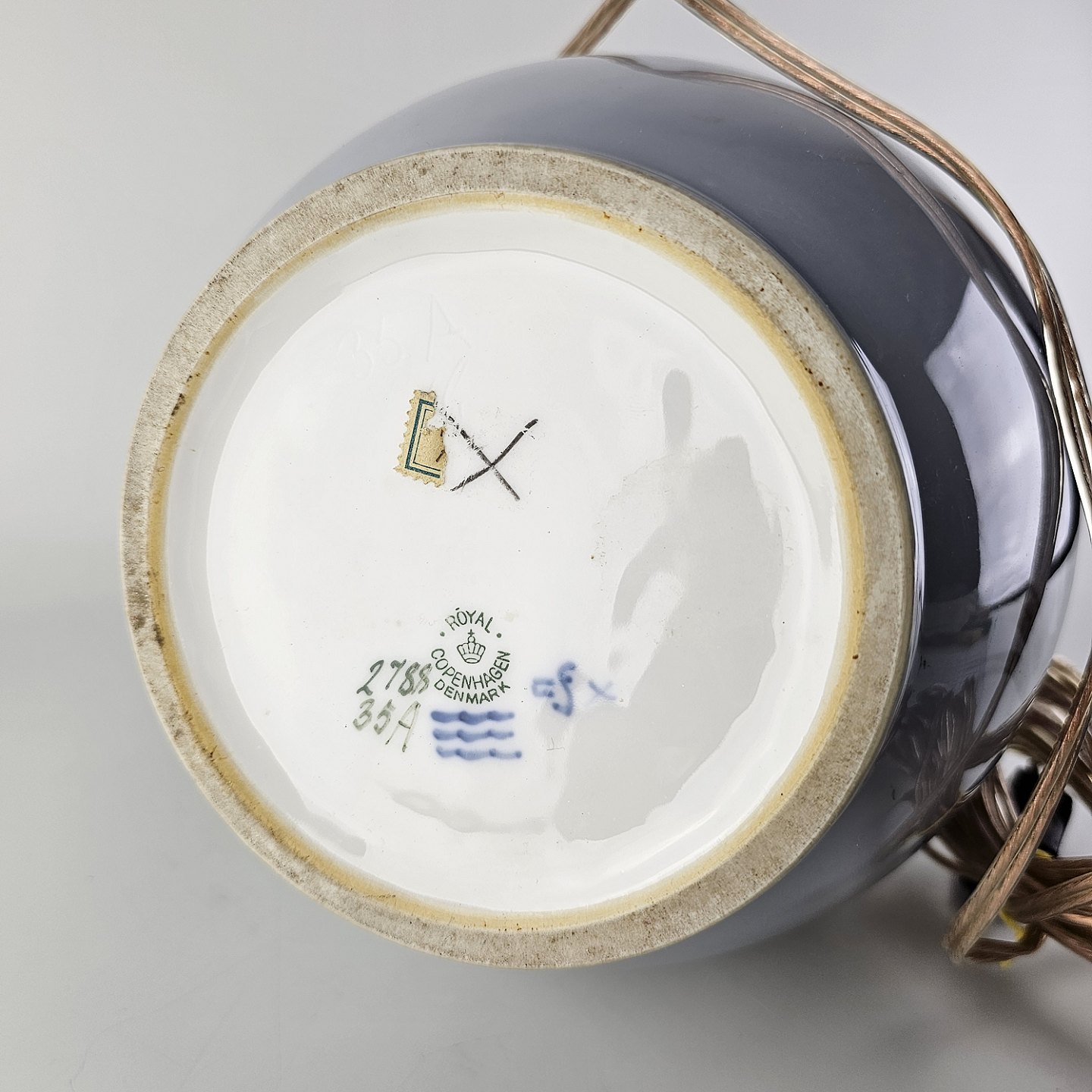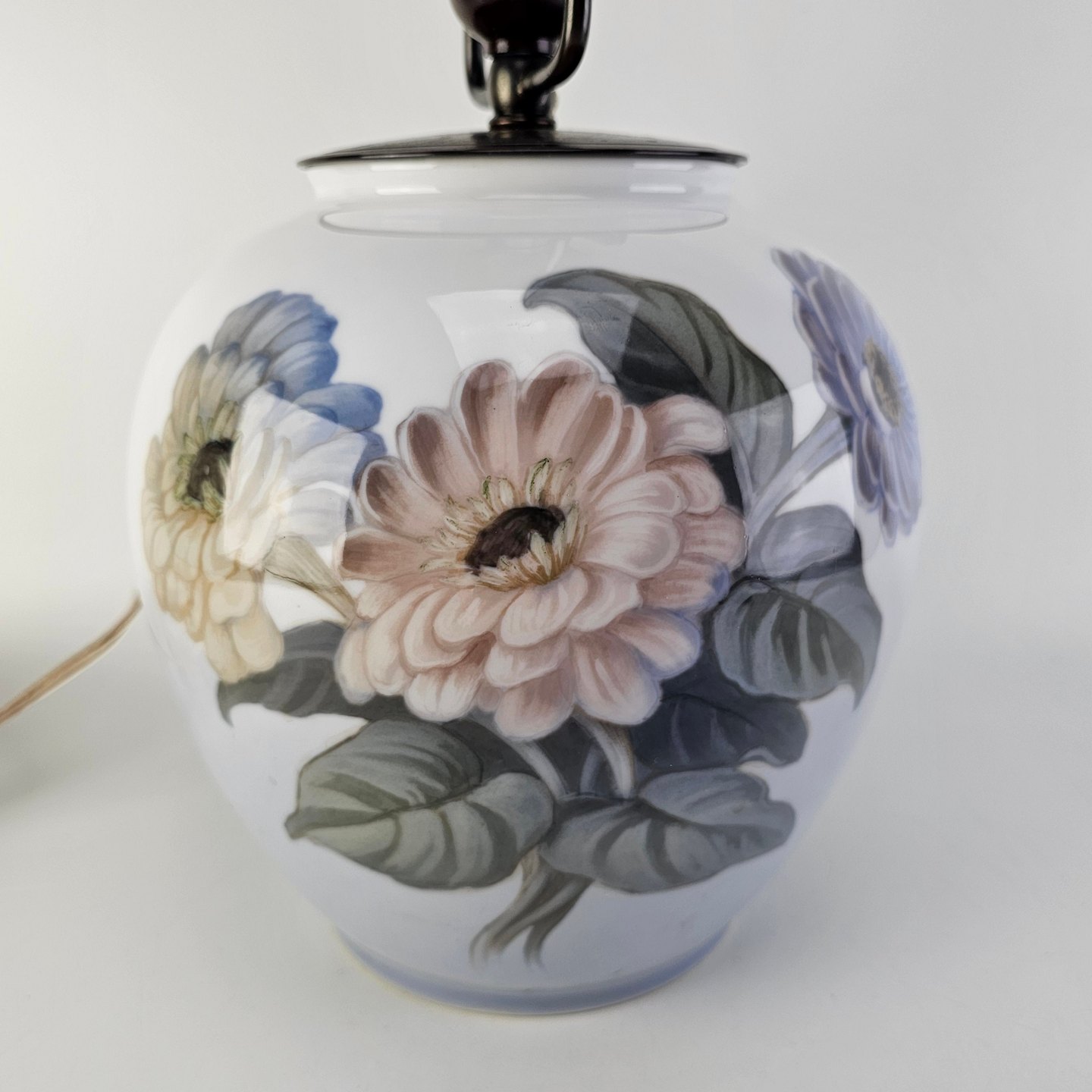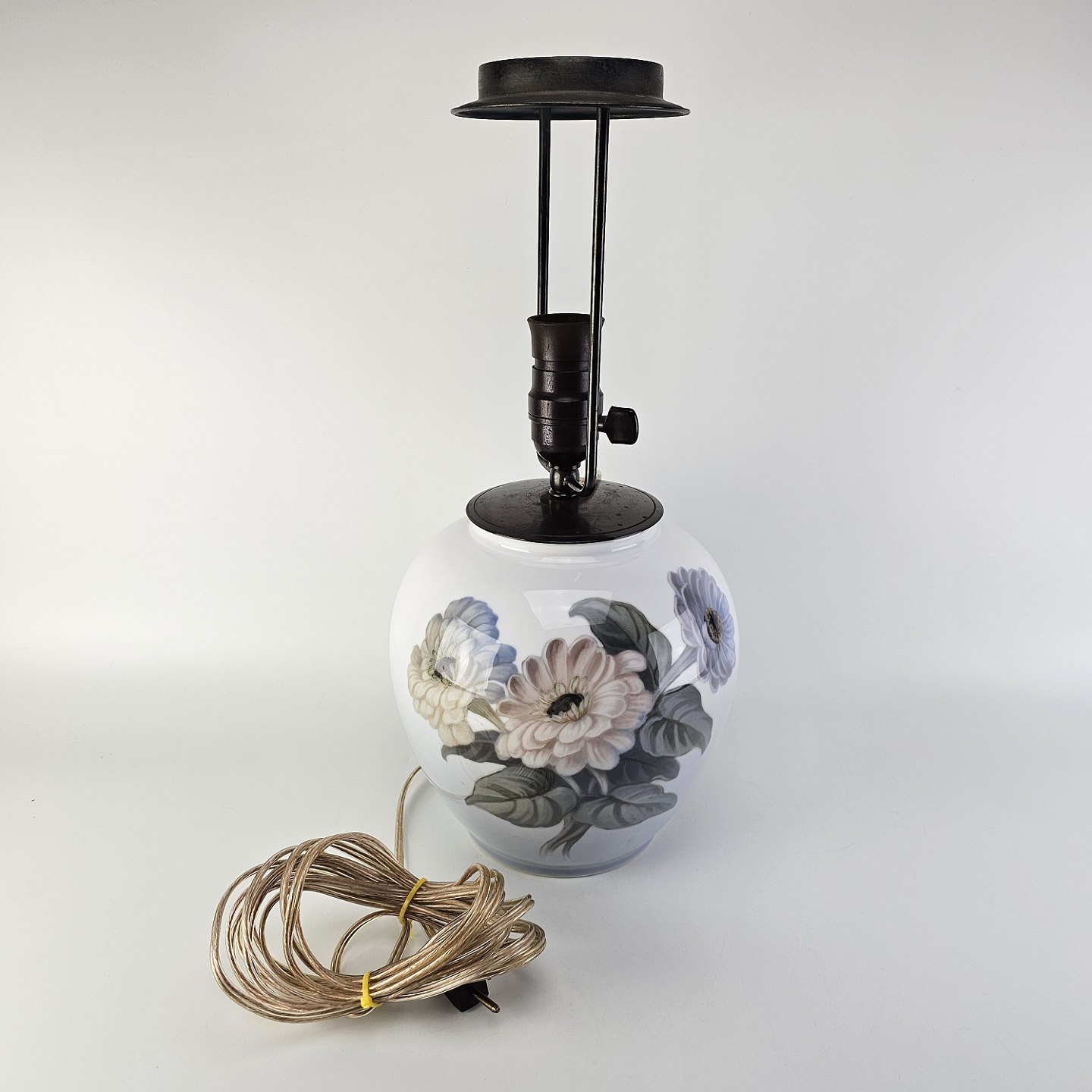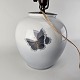 Beskrivelse: Bordlampe i hvidt porcelæn med dekoration af blomster og sommerfugle, og fatning i sort metal