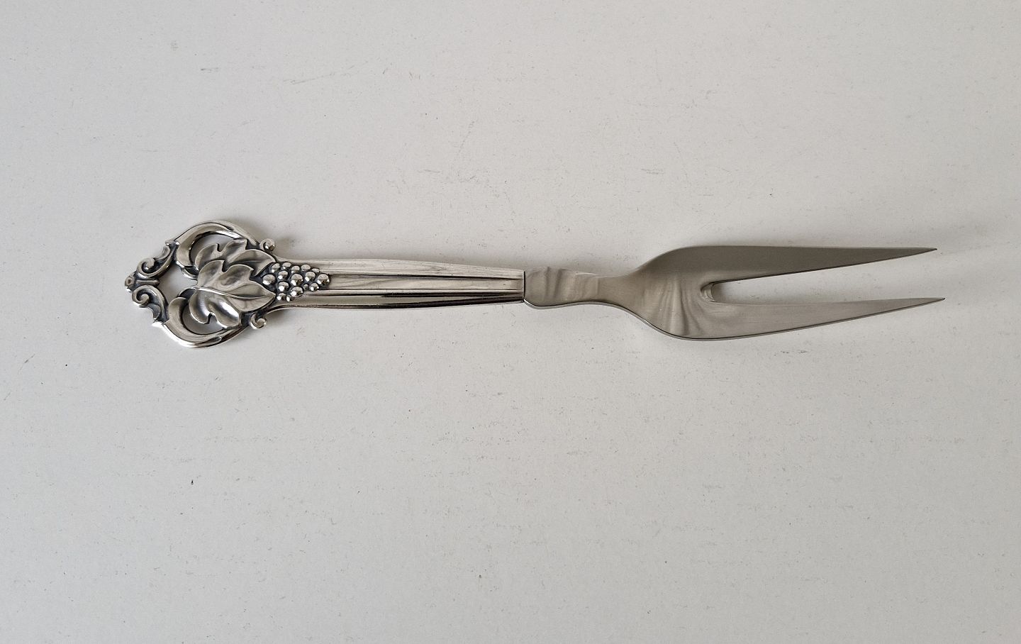 Description: Sering fork in silver and steel decorated with bunch of grapes.