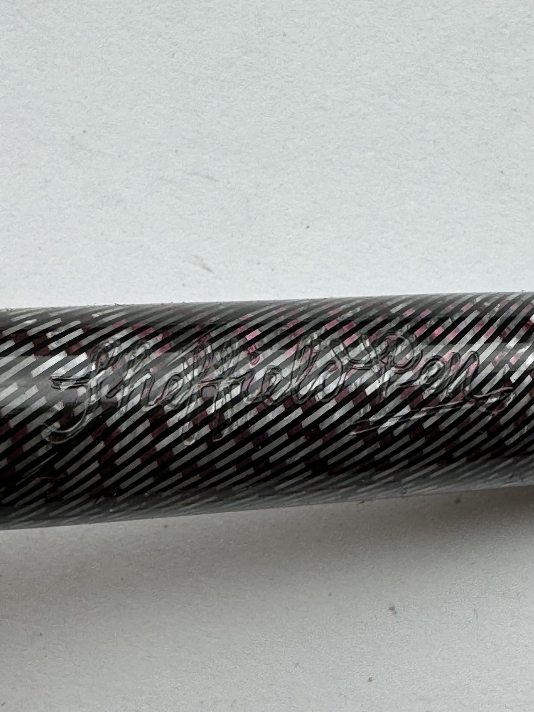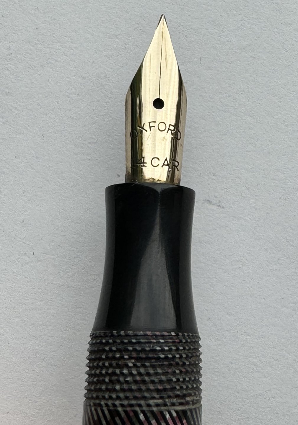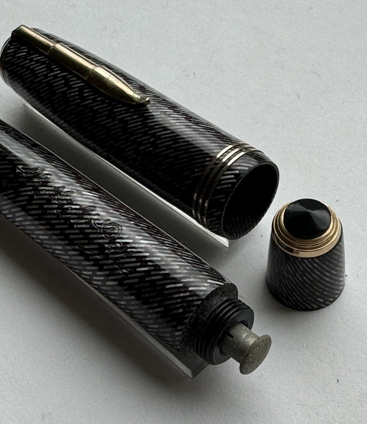 Beskrivelse: Sølv og grøn spiralstribet Sheffield Pen fyldepen fremstillet i 1940’erne. Spidsen er en 14 karat guldstoles fra Oxford. Muligvis et dansk produkt. Har F.eks. Lighed med fyldepenne fremstillet hos Penol. Fremstår i god stand. Fungerer ikke. Der skal indsættes ny gummisæk før end pennen kan optage blæk og skrive igen. Ny gummisæk kan indsættes mod et tillæg på kr. 250,- til fyldepennens pris. Mål: 12,2 cm