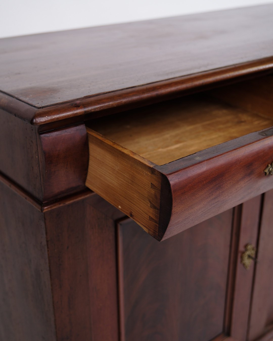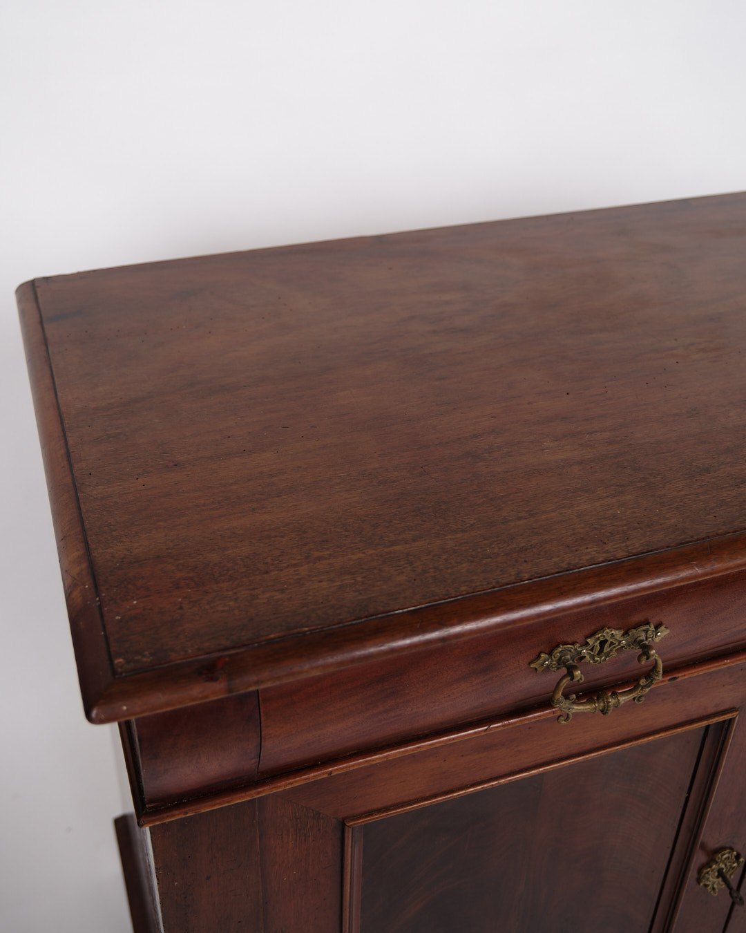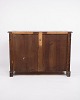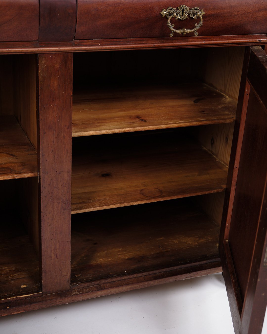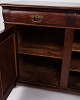 Beskrivelse: lav antik skænk fra 1880’erne, udført i håndpoleret mahogni. Skænken er indrettet med faste hylder og fremstår med tidstypiske detaljer, der vidner om 1800-tallets solide snedkerhåndværk.