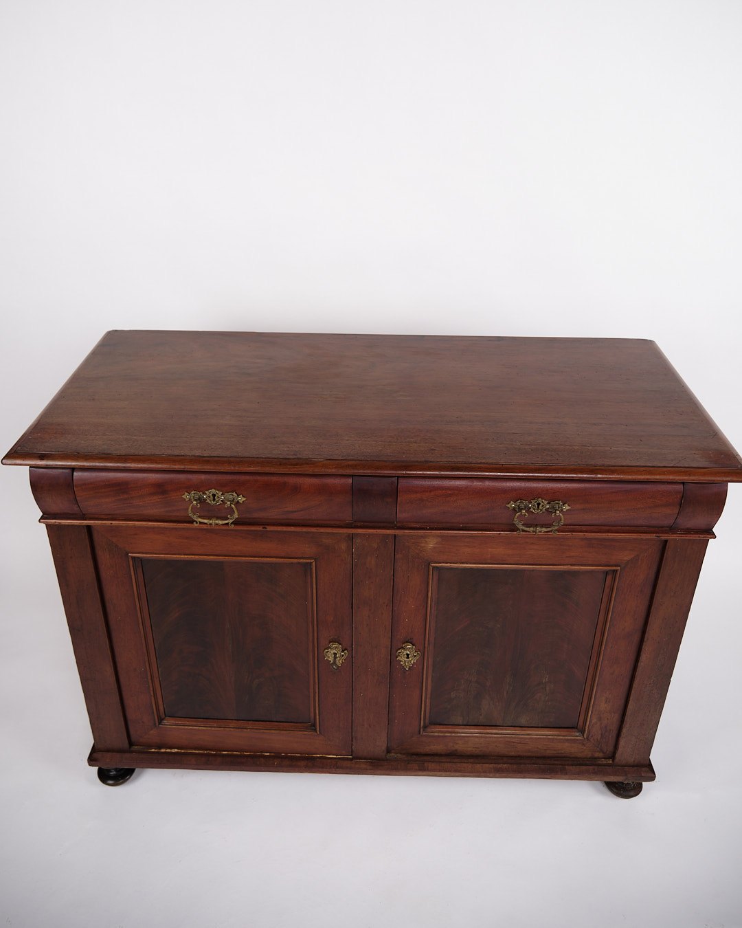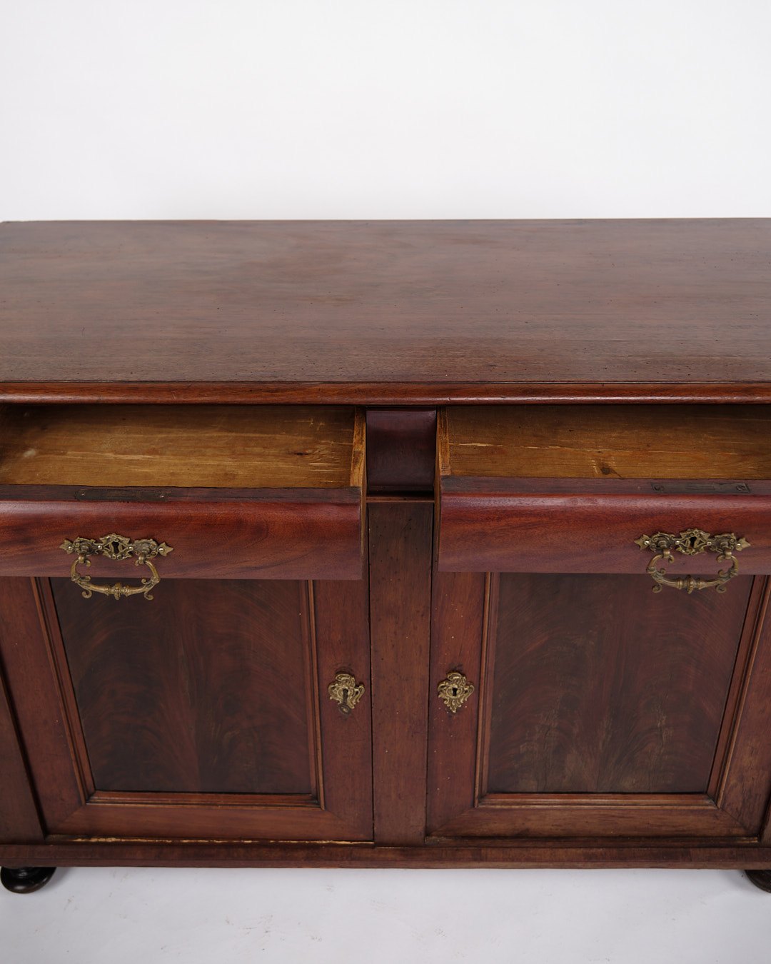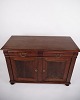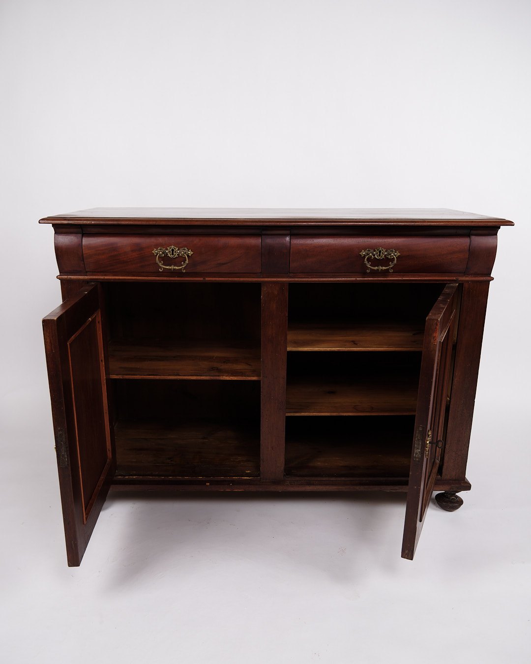 Beskrivelse: lav antik skænk fra 1880’erne, udført i håndpoleret mahogni. Skænken er indrettet med faste hylder og fremstår med tidstypiske detaljer, der vidner om 1800-tallets solide snedkerhåndværk.