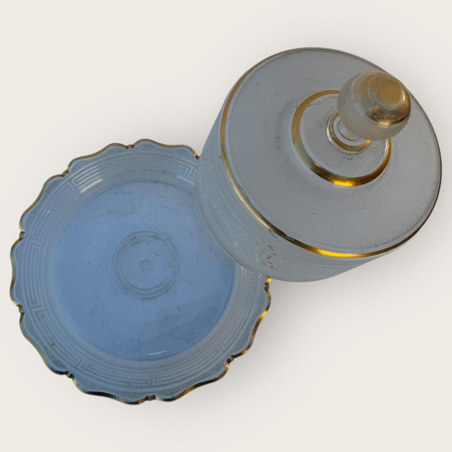 Beskrivelse: Klokke til madvarer i frostet glas med guldbemaling, lidt patinering på guldet ellers fin stand, diameter 23cm, højde 15cm